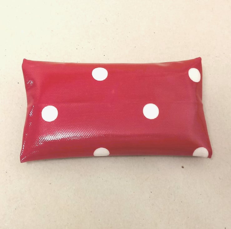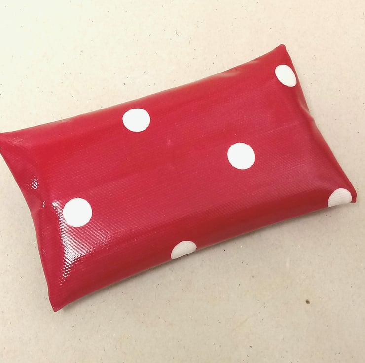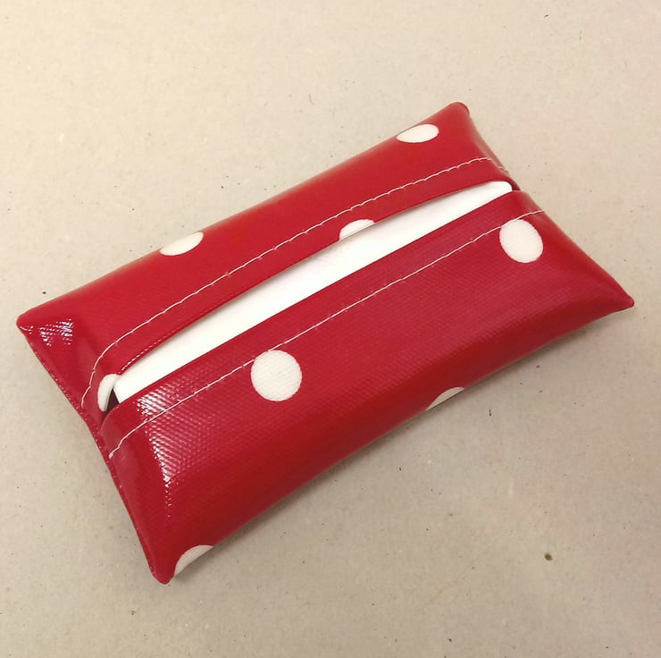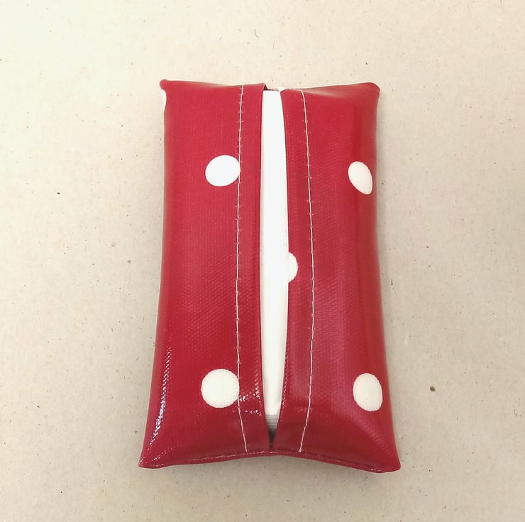 This is a lovely tissue holder, handmade in a red oilcloth with white spots.