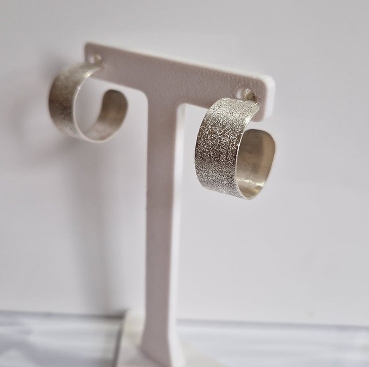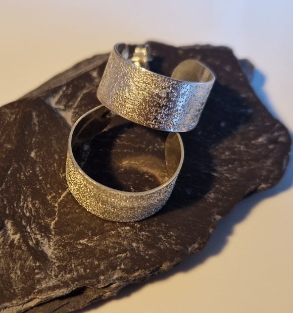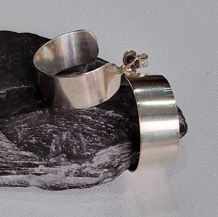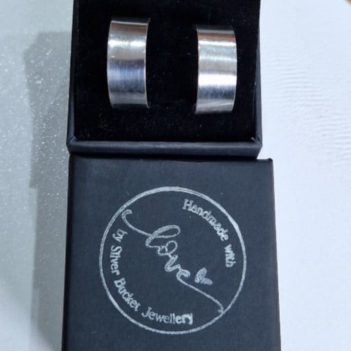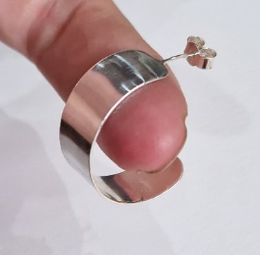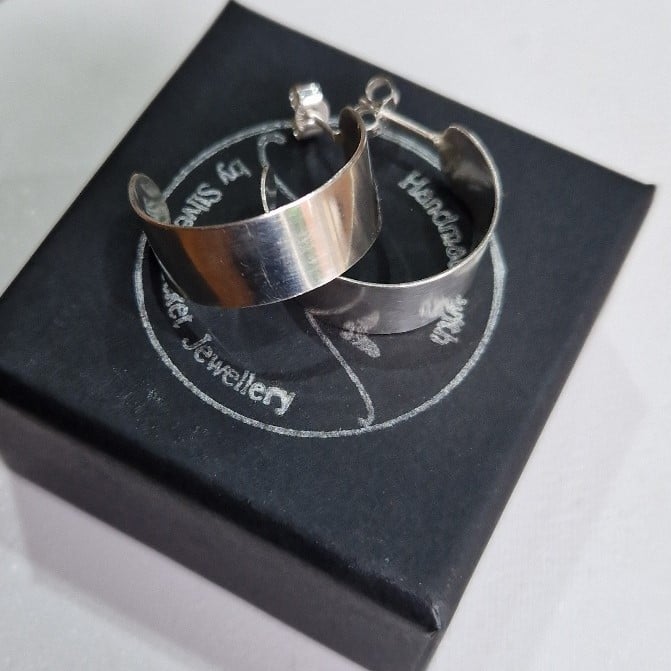A pair of handmade sterling silver hoop earrings, wide band, plain or textured.