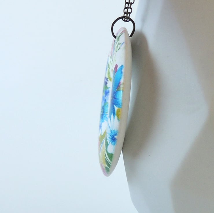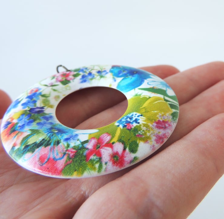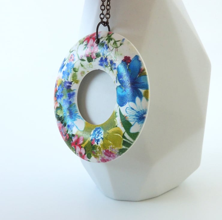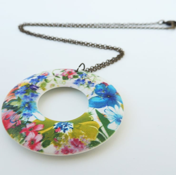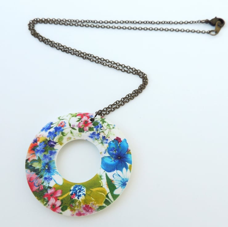 This cheerful flower print pendant comprises of a lightweight wooden 'doughnut' ring, and 18" of antique brass chain with a matching lobster clasp fastening.