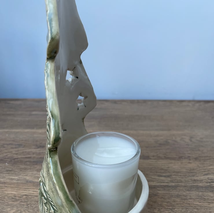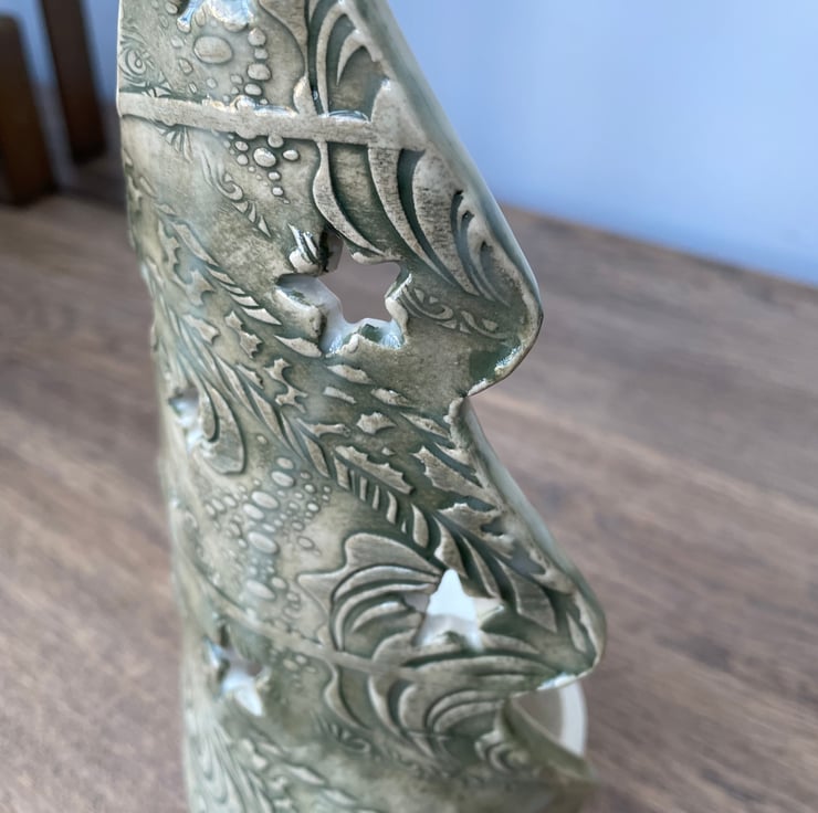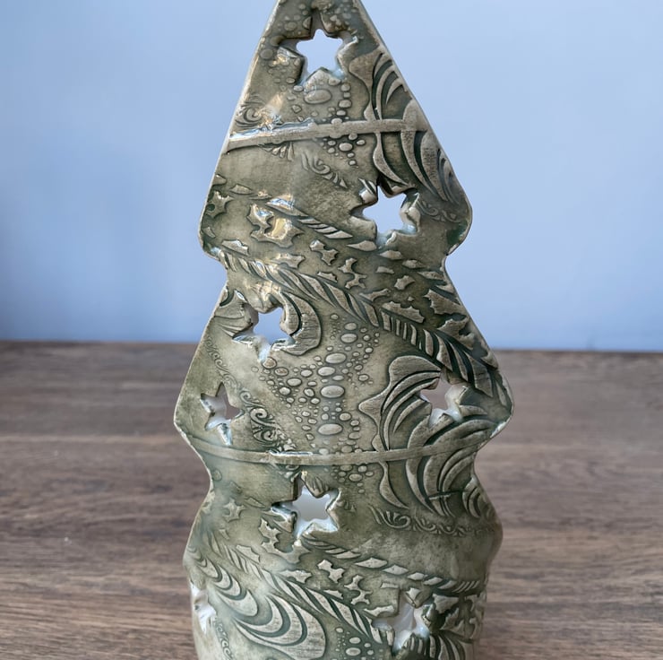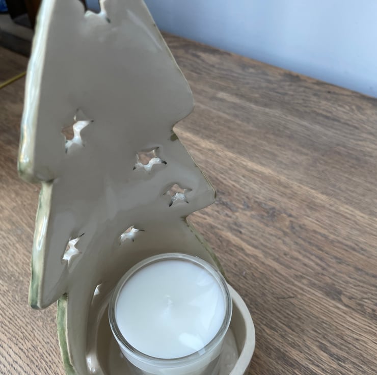 Handmade ceramic Christmas tree luminary for candle or LED candle green white