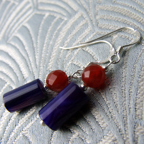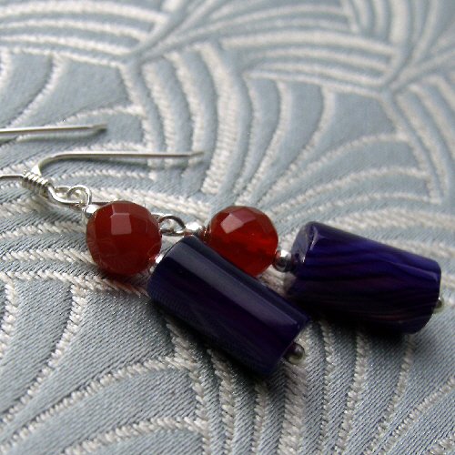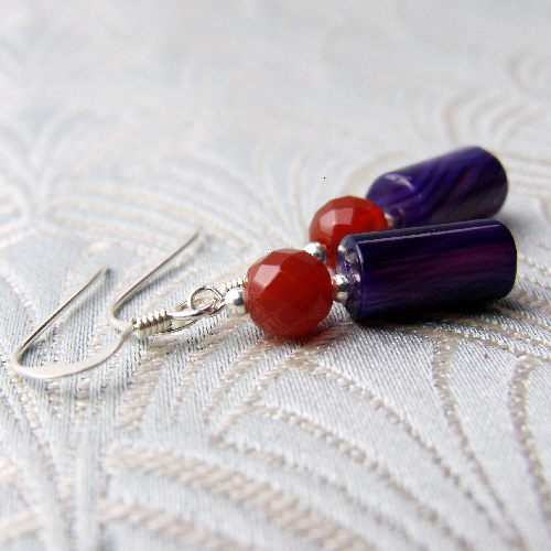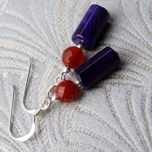 Small drop earrings with a tube of purple agate topped with a round carnelian bead.
