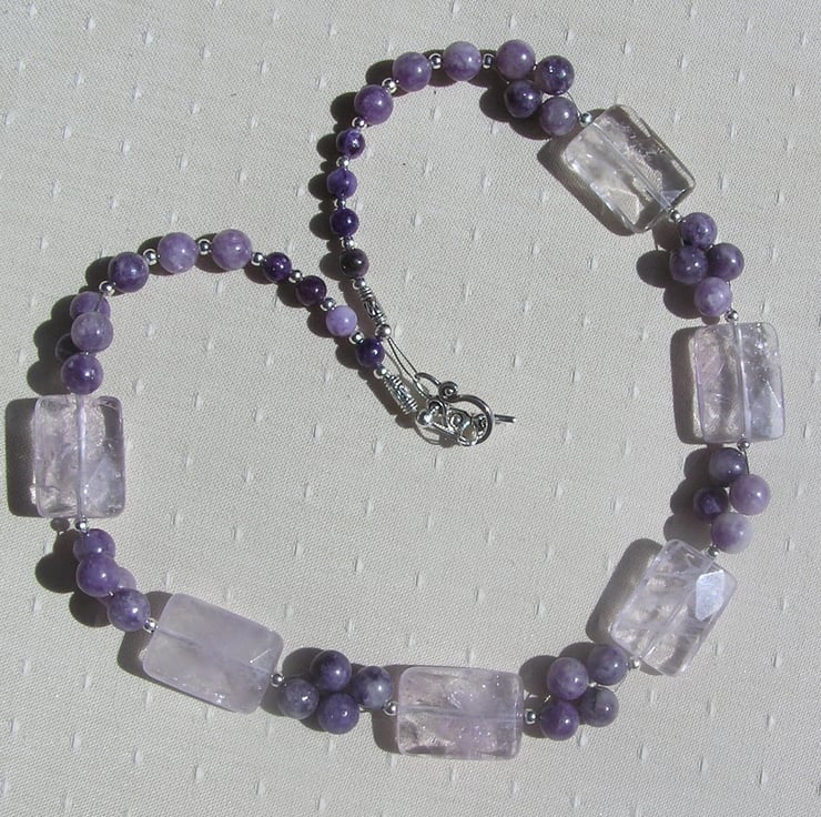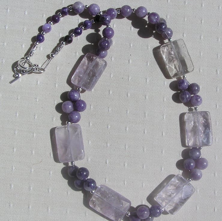 This Stunning Necklace is made from Six Rectangular Faceted Ametrine beads separated by Purple Lepidolite round beads ranging in colour from Dark Purple to a Pale Lilac clustered together in four's separated by tiny Silver spacer beads (this is one of my most expensive necklaces but it is truly spectacular)- a Beautiful Soft & Soothing combination that will look stunning either worn casually or with something more Elegant for a Special Evening out