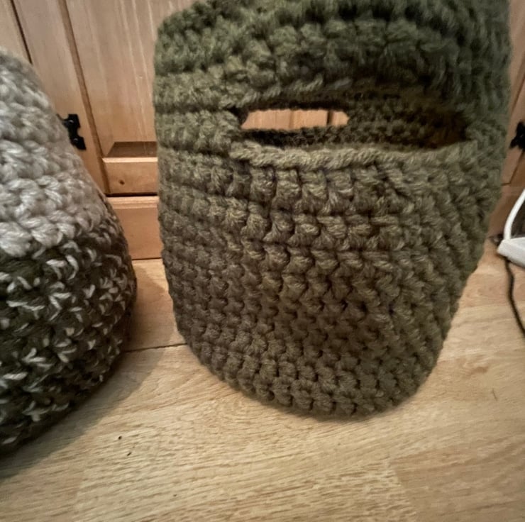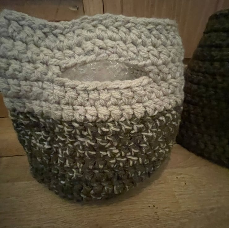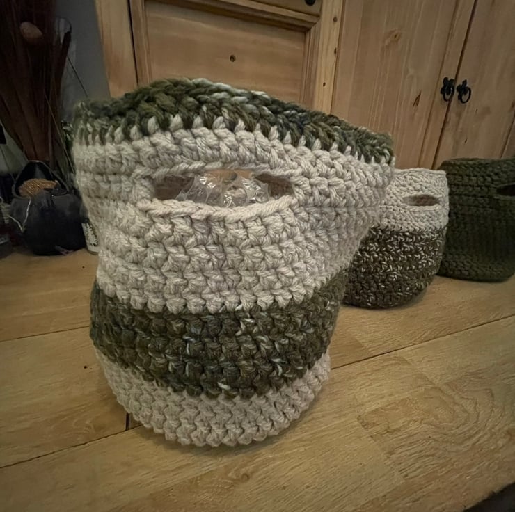 Crocheted with double strand chunky yarn in oatmeal/stone/green. This is a set of three storage bags L,M,S. They are extremely sturdy, hard wearing, will flat pack when not in use and can be machine washed and tumble dried!