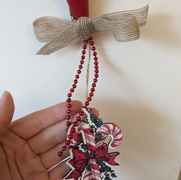 Intricately handcrafted Victorian style Christmas ornament. This makes for a unique eyecatcher in traditional Christmas colours. I have always been fascinated by the Victorian way of life, as the Victorians " invented " Christmas as we know it. The whole family would gather to craft ornaments, using paper, fabric scraps, tinsel ect. to bring brightness and coziness into their home.