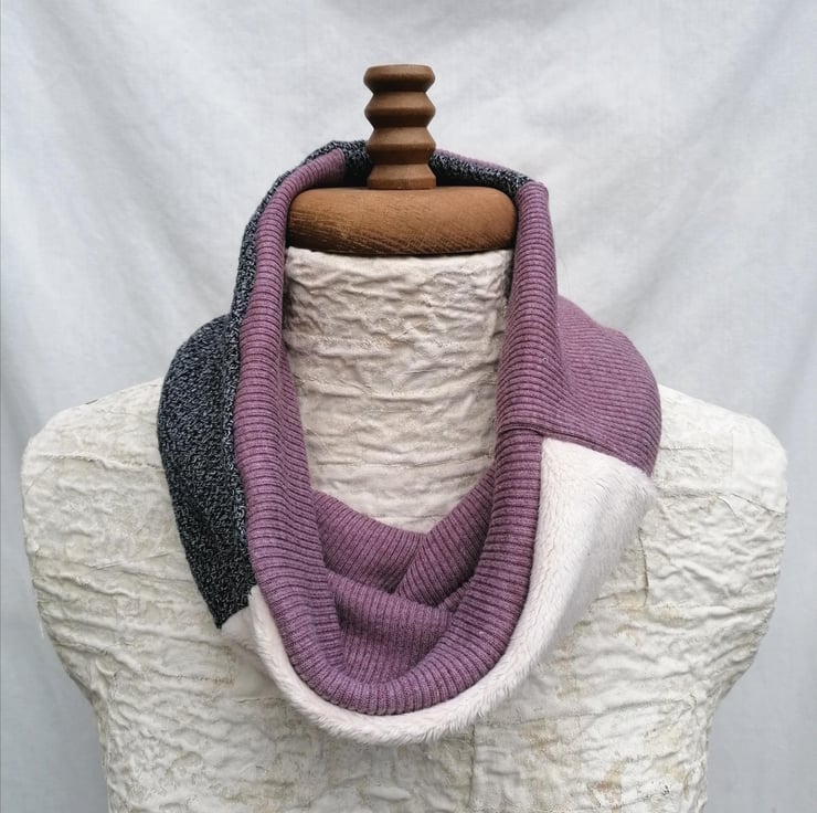 The neck warmer is a patchwork of pieces cut from a grey sweater, a heather sweater and a cream fleece sweater. Sewn together to create a colour block design.
