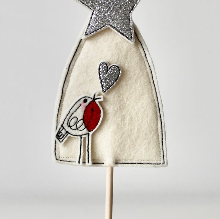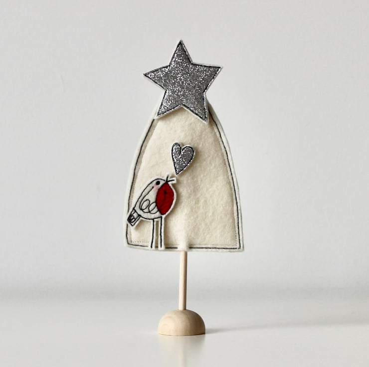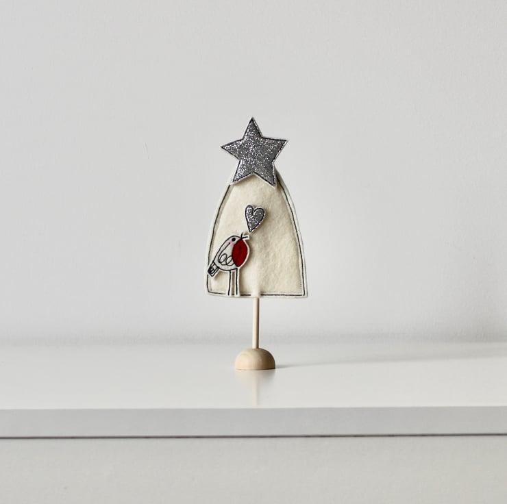 A tree, with a glitter star, a Robin, a heart, a wooden stem and a wooden circular stand.