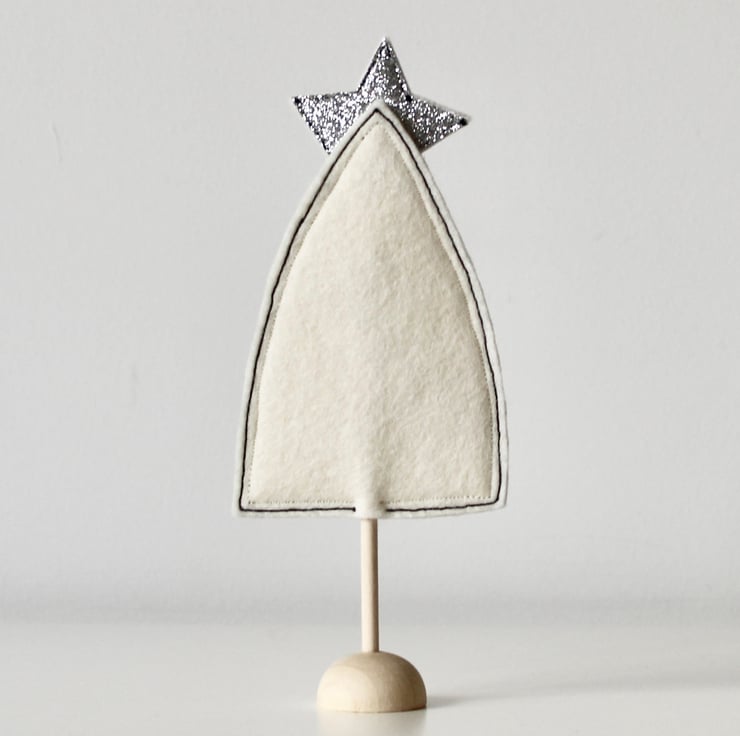 Trees are created using free hand machine embroidery, 100% wool felt, glitter cloth and a sanded wooden trunk and base.