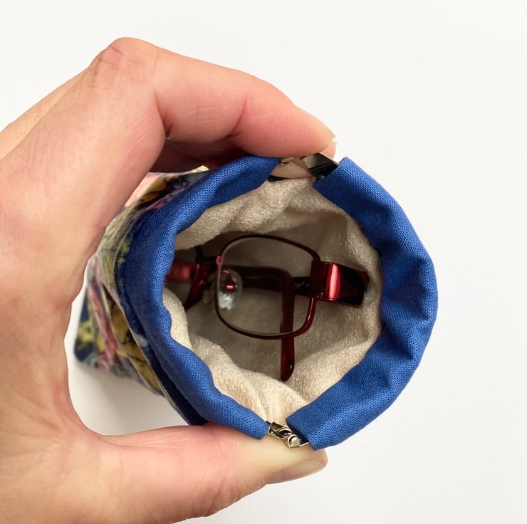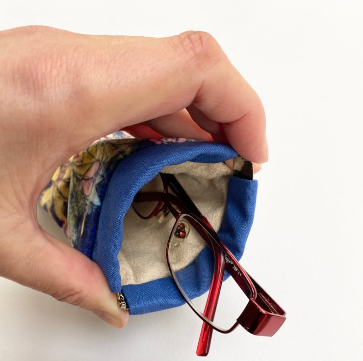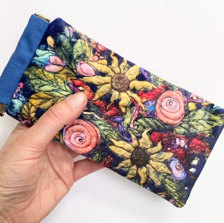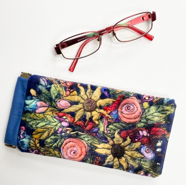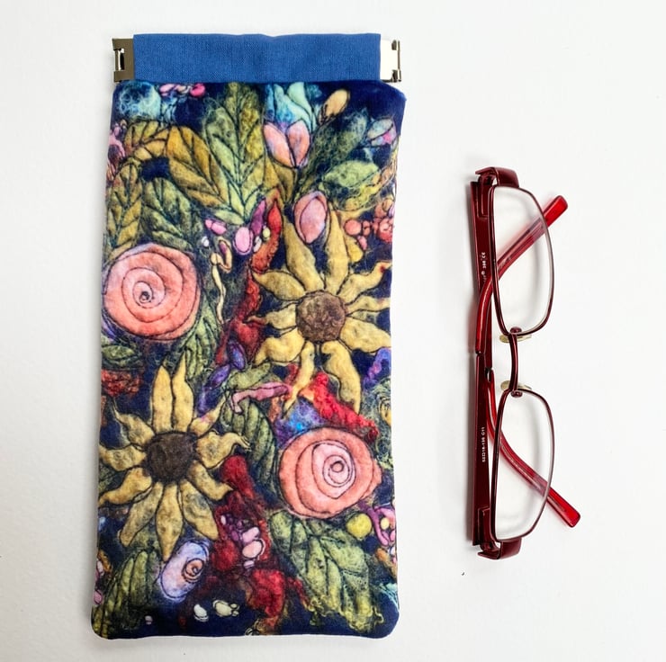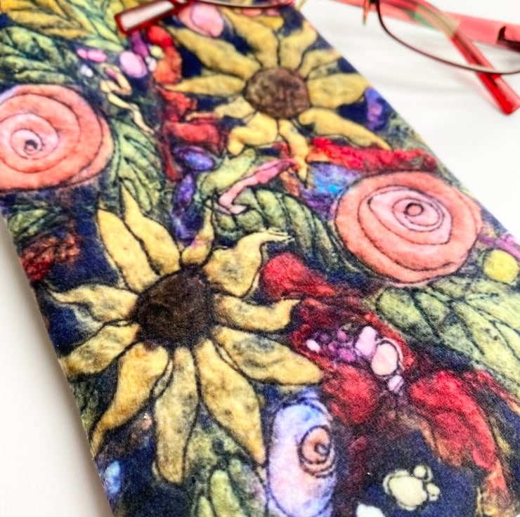 This beautifully soft glasses case is made with a print of one on my felted pictures. It’s covered in flowers like sunflowers and roses.