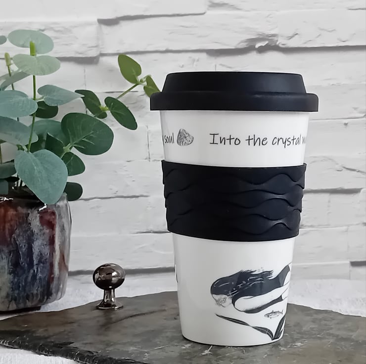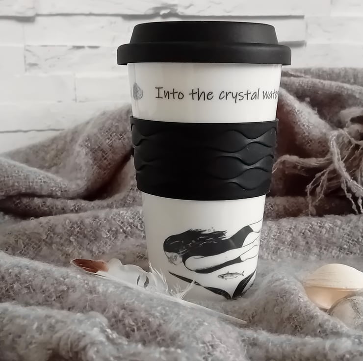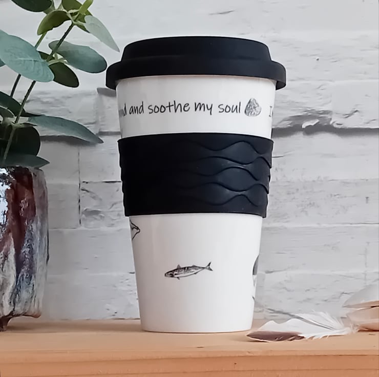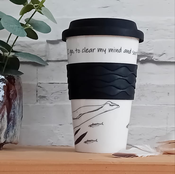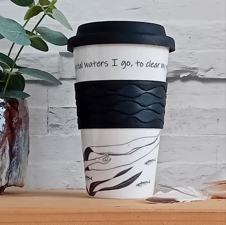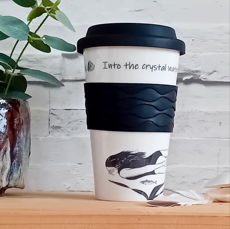 My bone china reusable travel cup with its female swimmer, fish and swimming quote is the ideal gift for swimmers, whether they prefer wild swimming in the sea, lakes or rivers, or swimming lengths in their local pool. It features the quote “Into the crystal waters I go, to clear my mind and soothe my soul”.