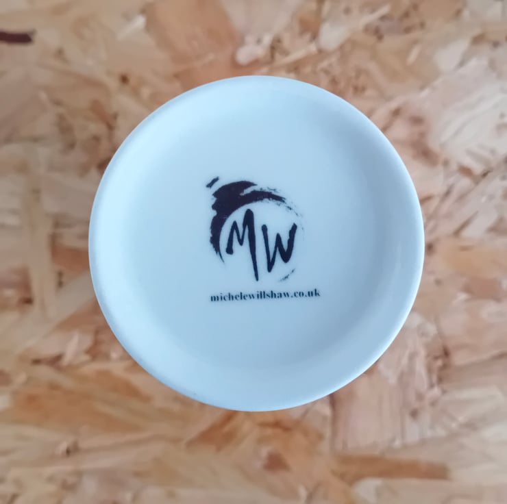 The decoration on this cup is taken from my original illustrations and lino prints. I apply the designs by hand, then fire them in the kiln, making them hard wearing.