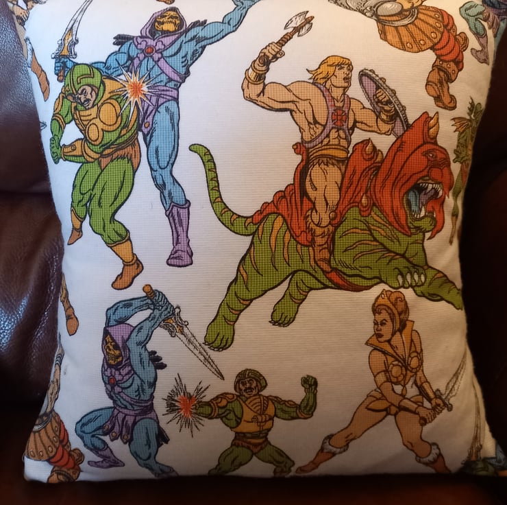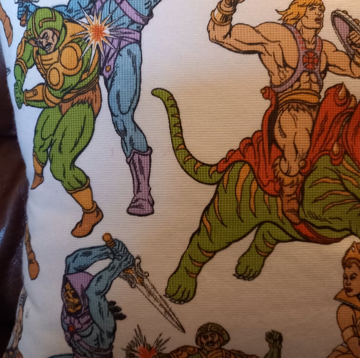 Fabulous vintage "He Man" fabric cushion cover (includes cushion pad). Handmade in my Somerset studio.