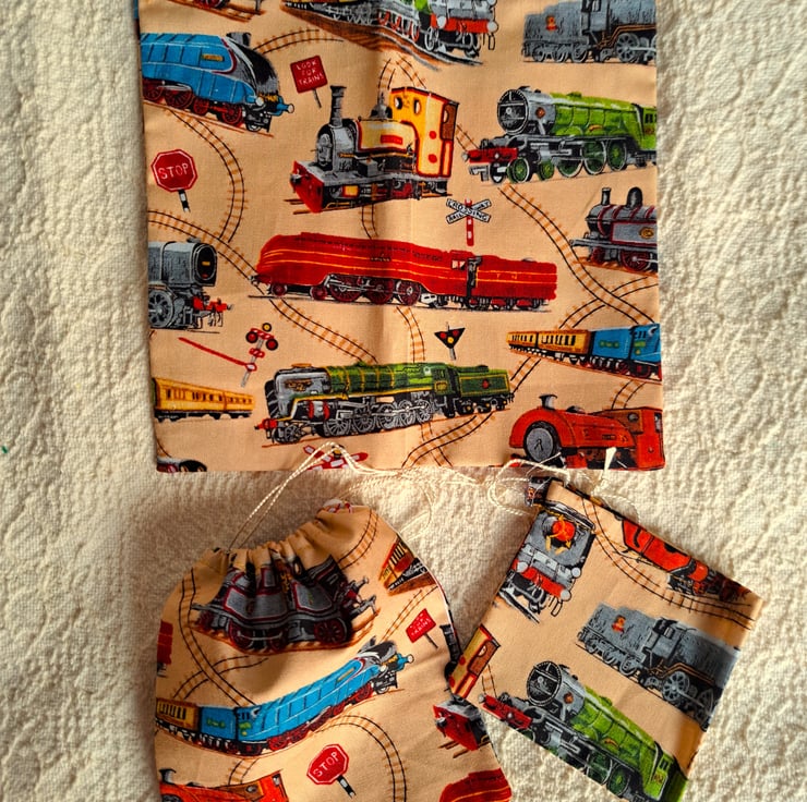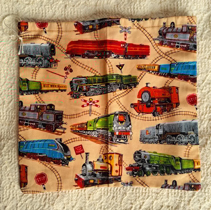 These packs consist of four beige cotton drawstring bags with colourful steam engines depicted on them. The largest measures at least 8" by 9" (21cm. x 23cm.), and the very smallest no less than 3.5" (9cm.) square. The bags vary in both size and shape within those parameters. They are made from the bits and pieces left after I have finished cutting out aprons, are all cotton, washable and re-usable.