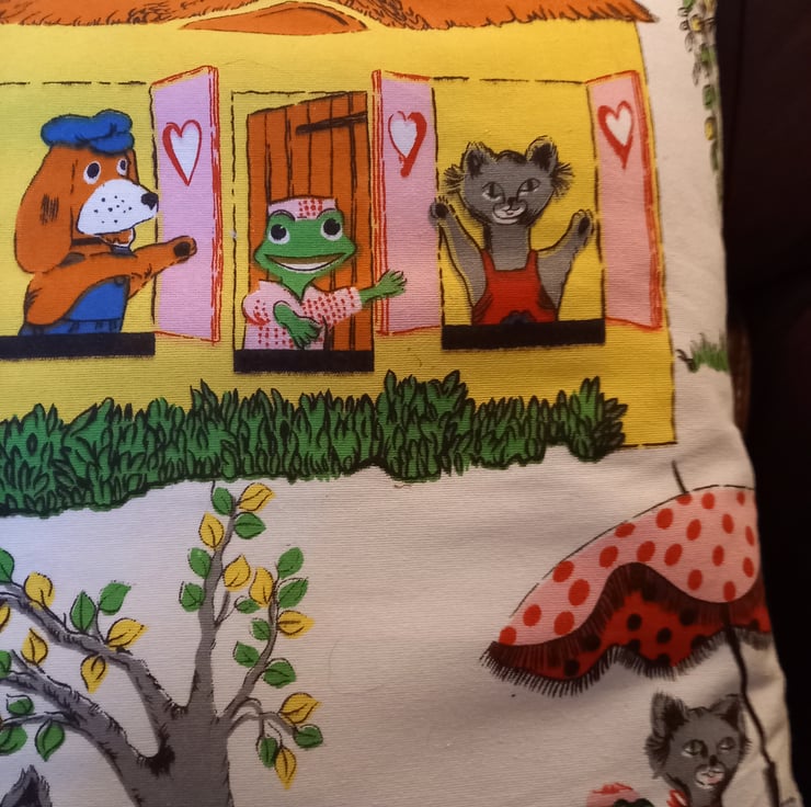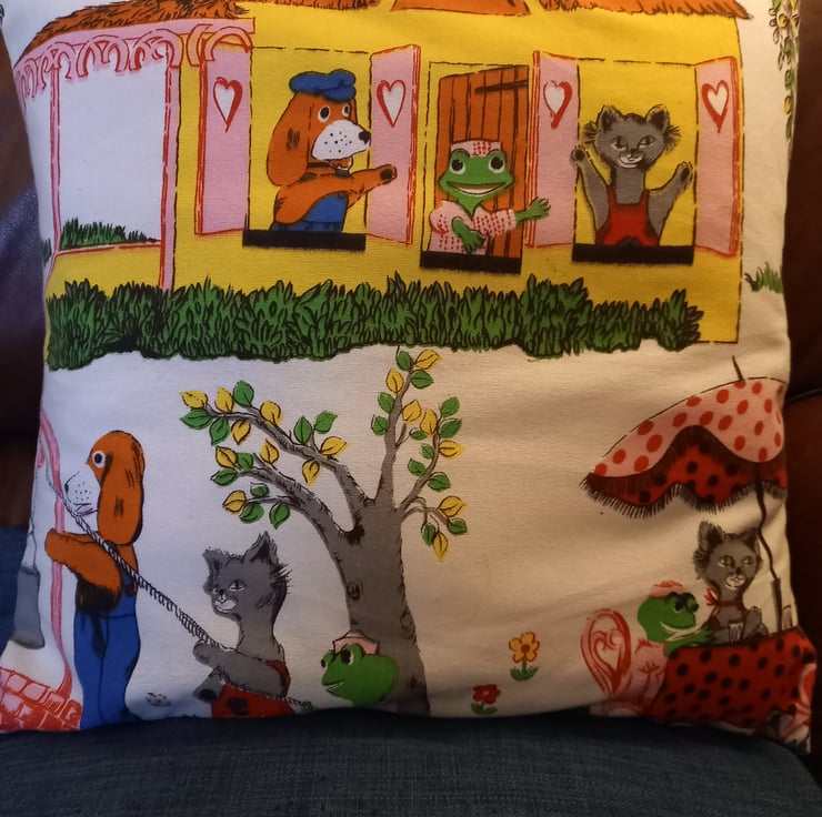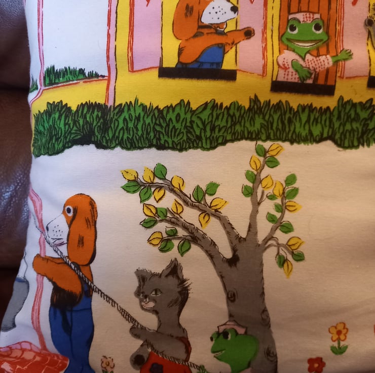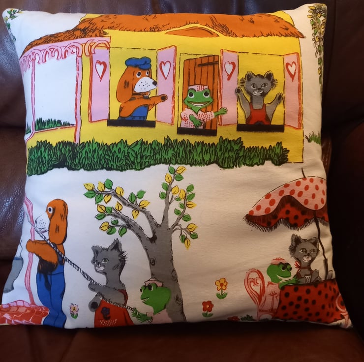 Fabulous cartoon vintage fabric cushion, featuring Hector and his friends Zsa Zsa and Kiki.