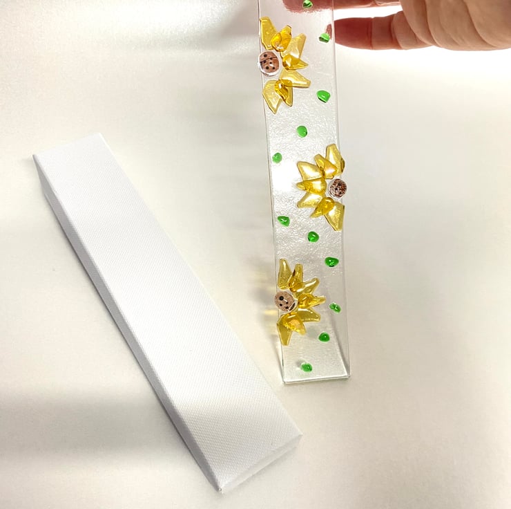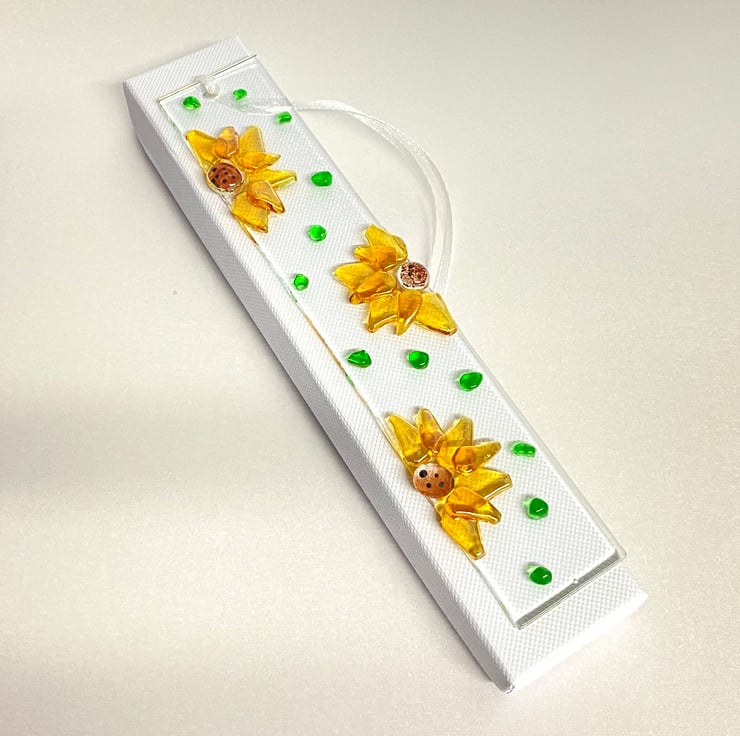 Pretty fused glass sunflowers on this sun catcher/wall hanging which measures approximately 10 in x 1.5 in and comes presented in a white gift box - perfect small gift for any occassion . Drilled and strung with white satin ribbon .
