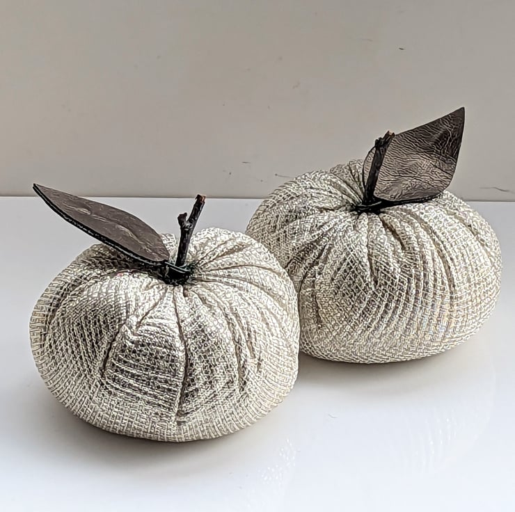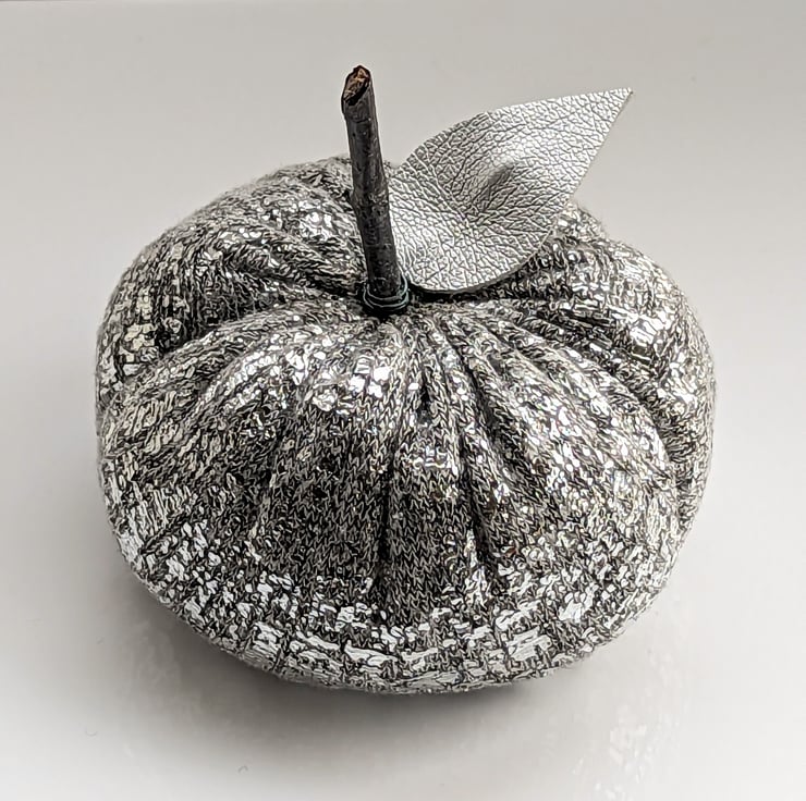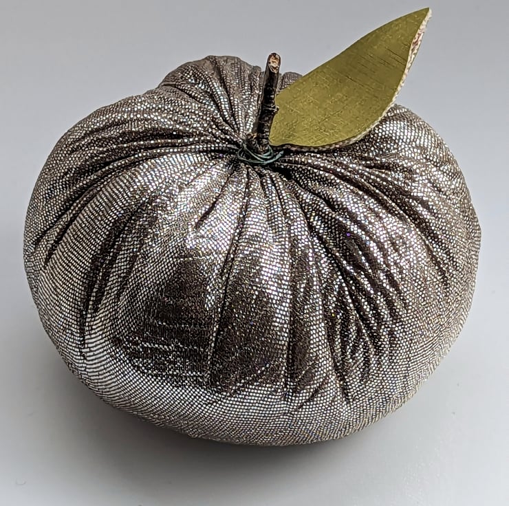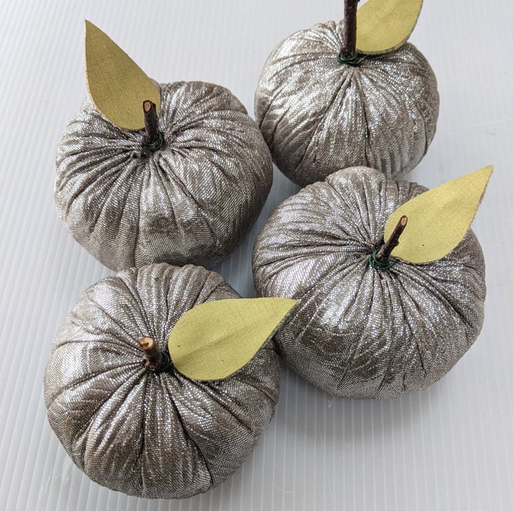 They are made from recycled fabrics; outdated party clothes whose next stop is landfill. The gold ones are from a sassy brocade miniskirt and the silver from a finely pleated top giving fuller apples. The stalks are made from birch twigs and the leaves are wired pale green vinyl. They are filled with polyester toy stuffing to give a round, plump shape with a layer of lentils in the bottom to give them weight and stability.