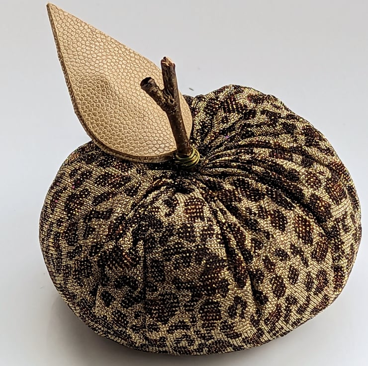 They are made from recycled fabrics; outdated party clothes whose next stop is landfill. The gold ones are from a sassy brocade miniskirt and the silver from a finely pleated top giving fuller apples. The stalks are made from birch twigs and the leaves are wired pale green vinyl. They are filled with polyester toy stuffing to give a round, plump shape with a layer of lentils in the bottom to give them weight and stability.
