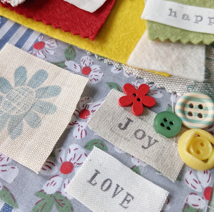 A collection of mixed fabric pieces with trims, buttons and hand stamped snippets and words.
