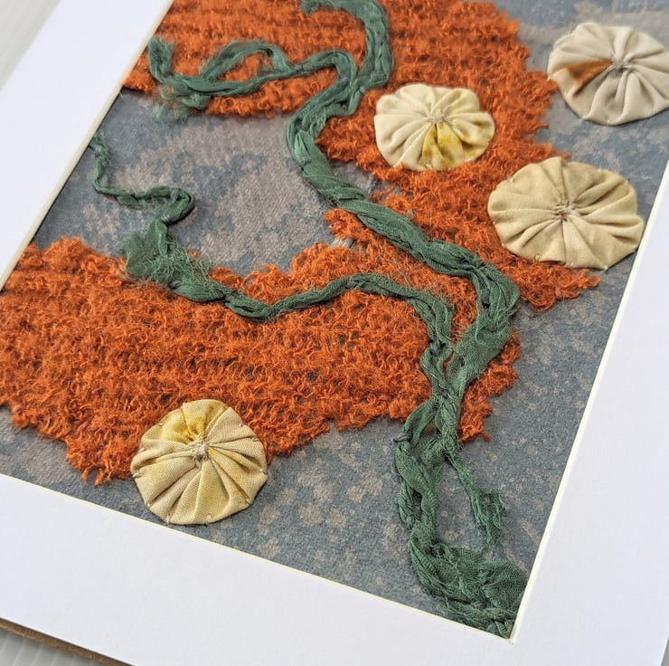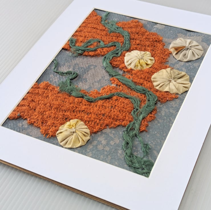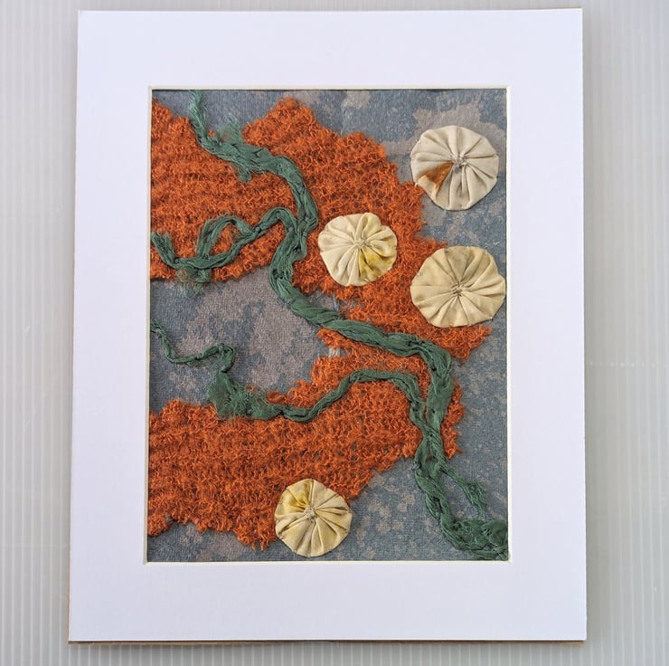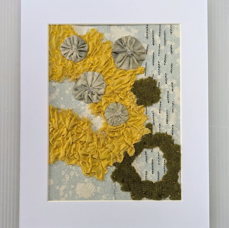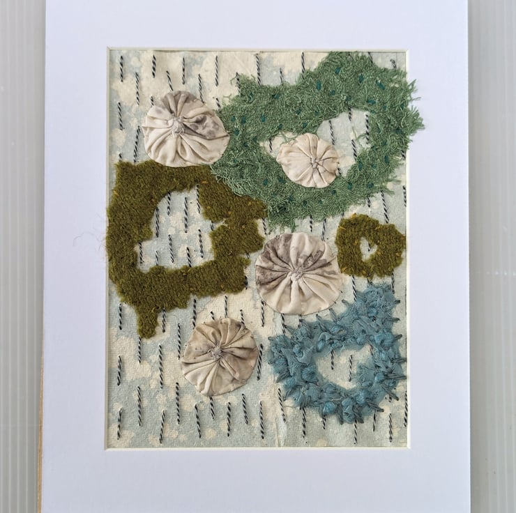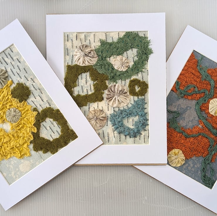 Small studies made using applique and stitch inspired by coastal textures on rag paper.