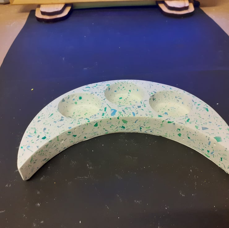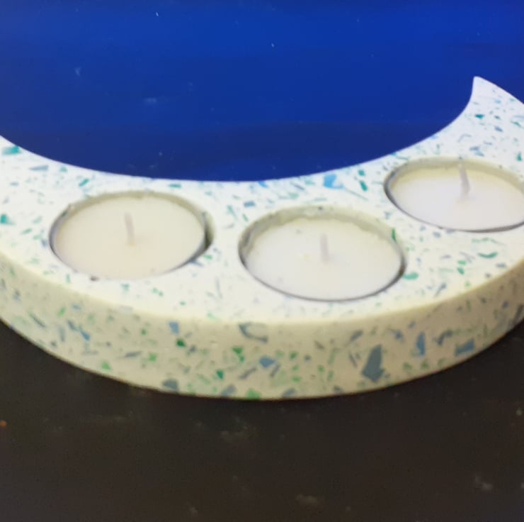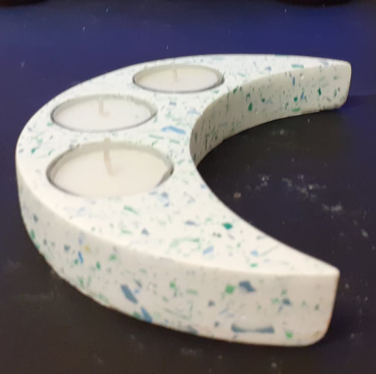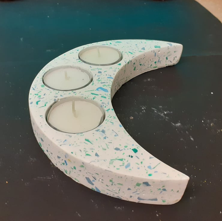 eco friendly moon shaped, terrazzo triple tea light holder.made in stonecast sealed,and with a felt base to stop scratching furniture,tea lights are not included.