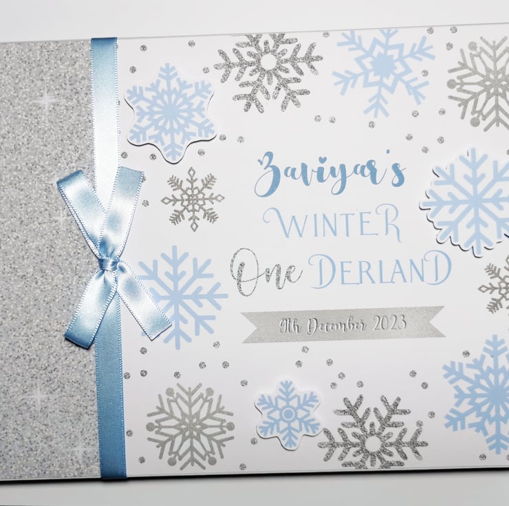 Winter Onederland boy's birthday guest book, Snowflakes birthday guest book