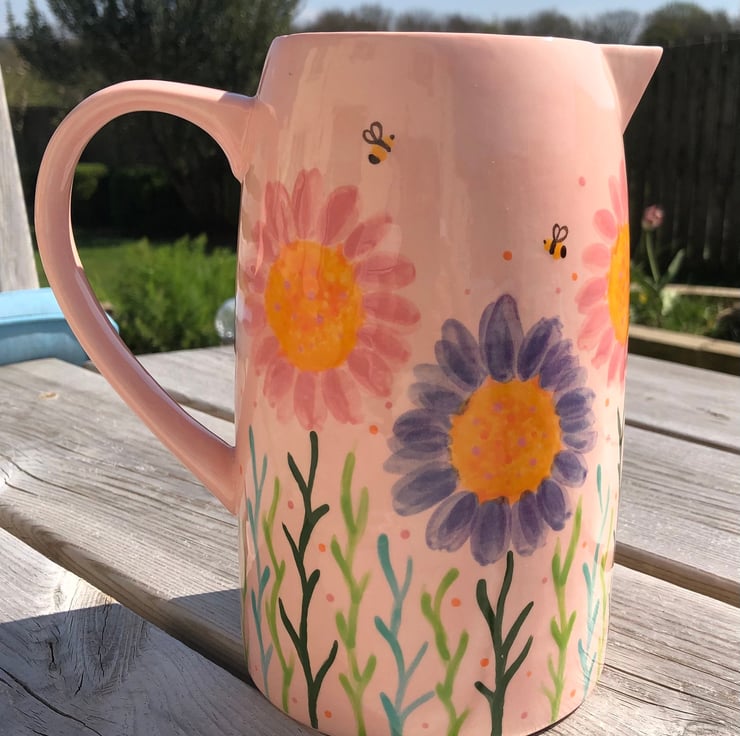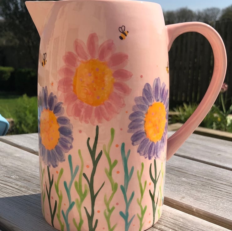 Pink and lavender floral design Jug. Hand painted. Large jugs are 20cm tall. Lovely as a jug or vase.