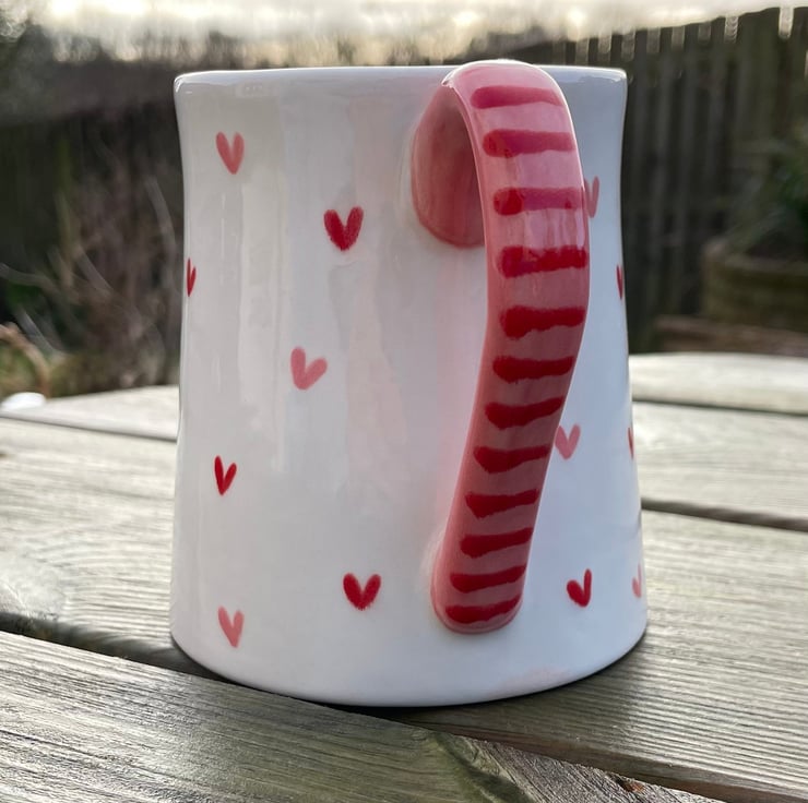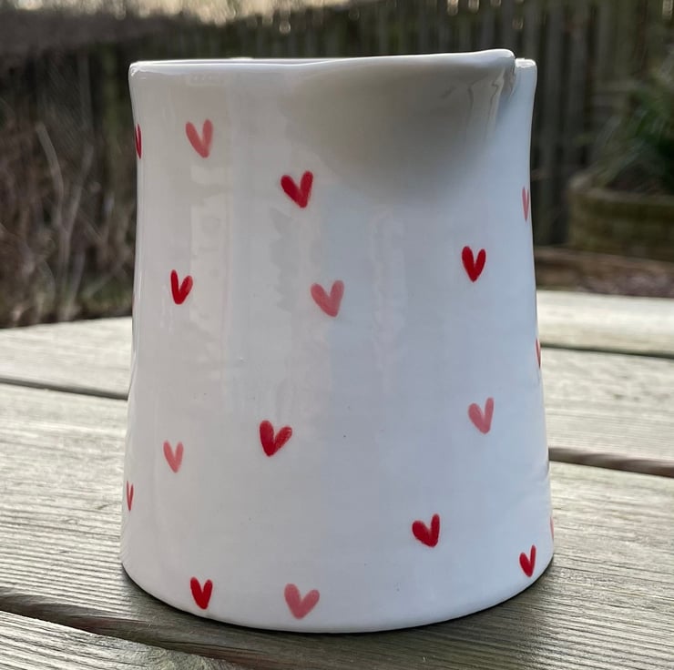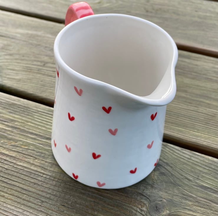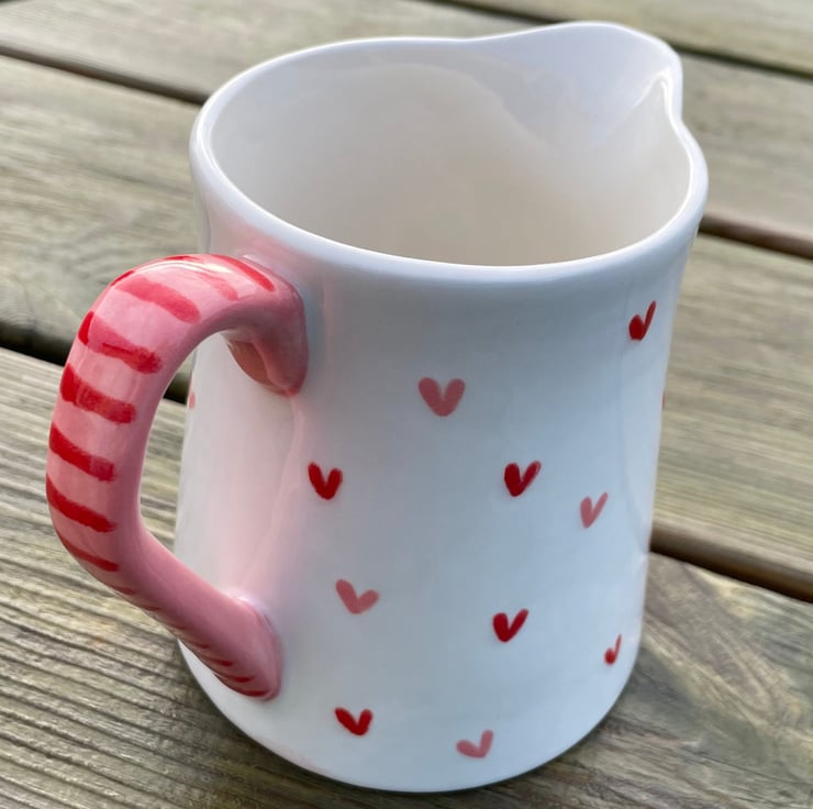 Hand Painted, glazed, fired and ready for use. A cute, hand made, white, pink and red sweet heart design, milk or gravy jug. Small jugs are 10cm tall.