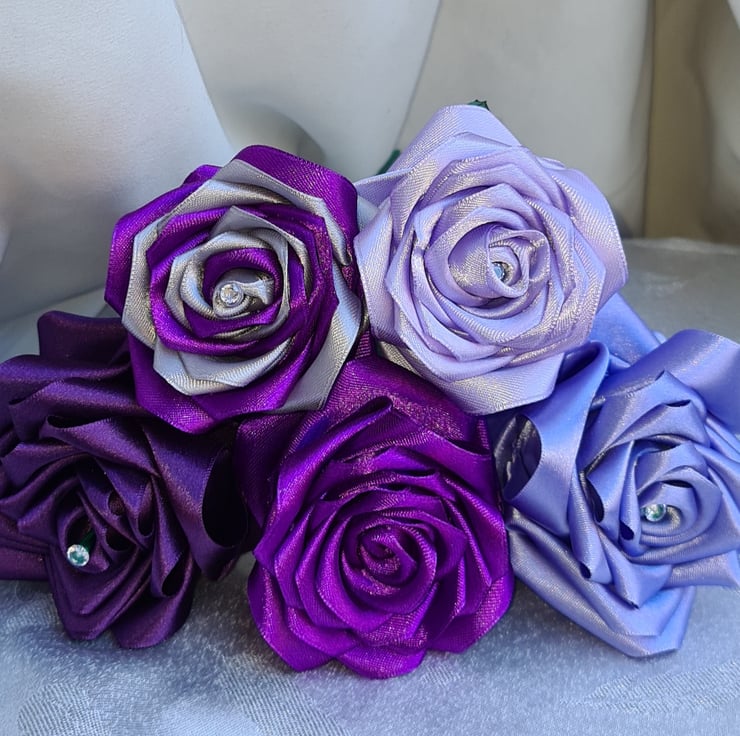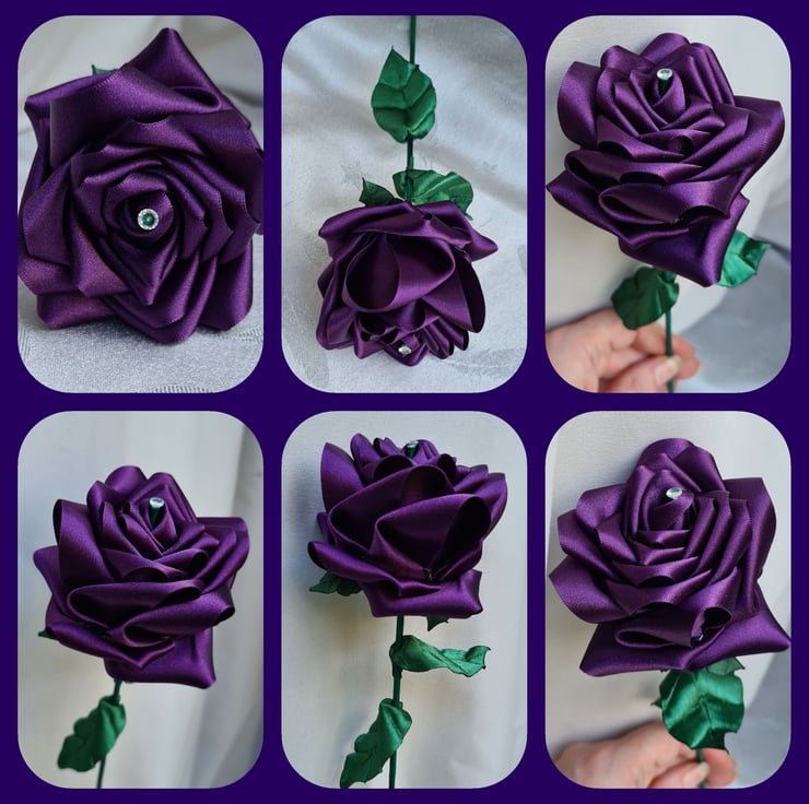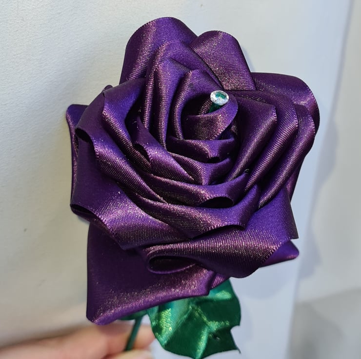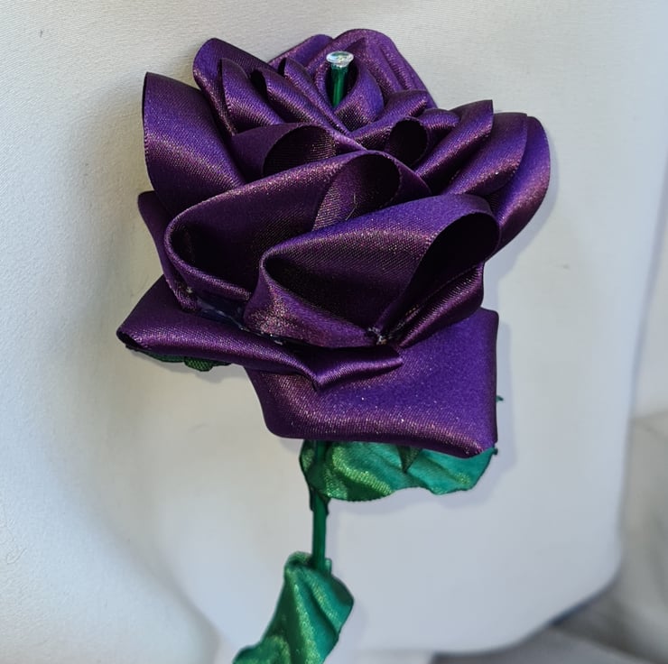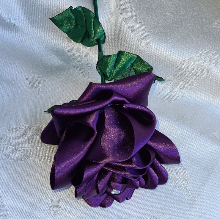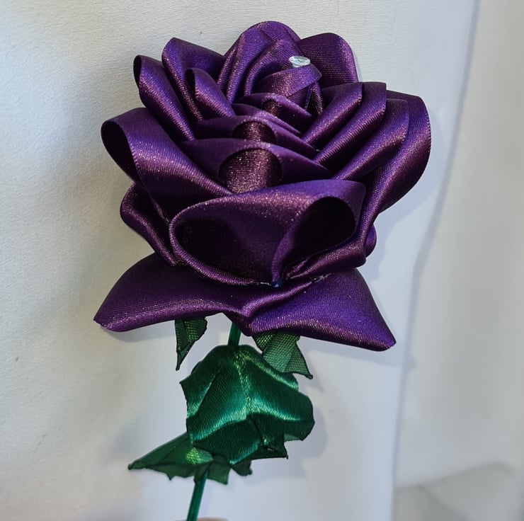A gorgeous handmade single stem rose (one flower only), made with beautiful, high quality Blackberry Purple Satin (Berisfords) ribbon. The stem is made from bamboo (Non-bendy) and painted Green with Dark Green Satin ribbon leaves. A gorgeous artificial flower gift.