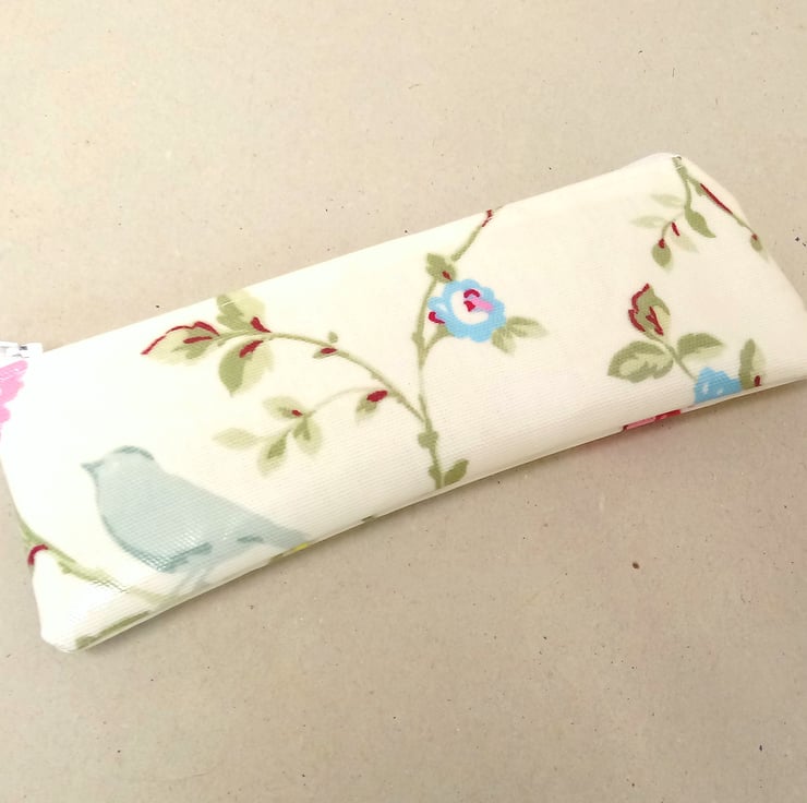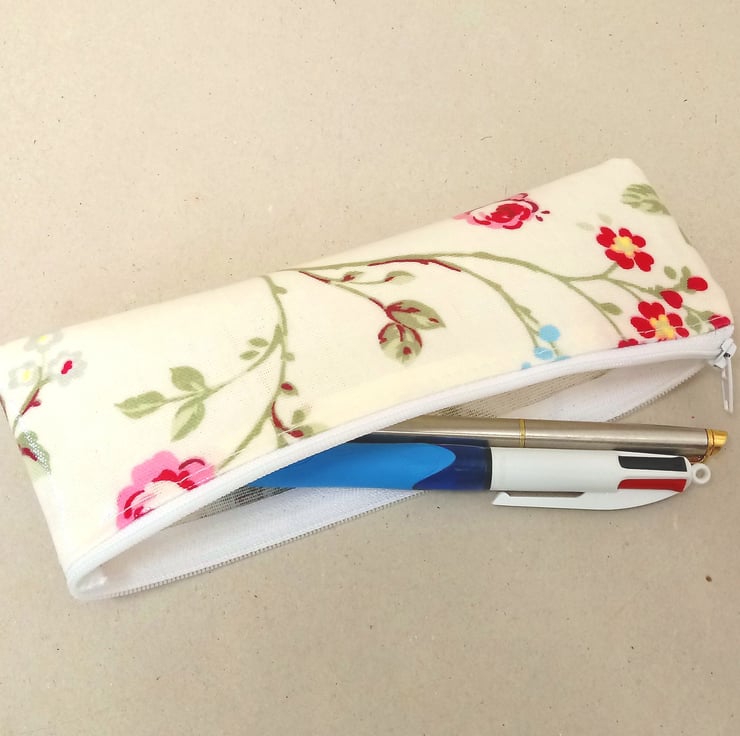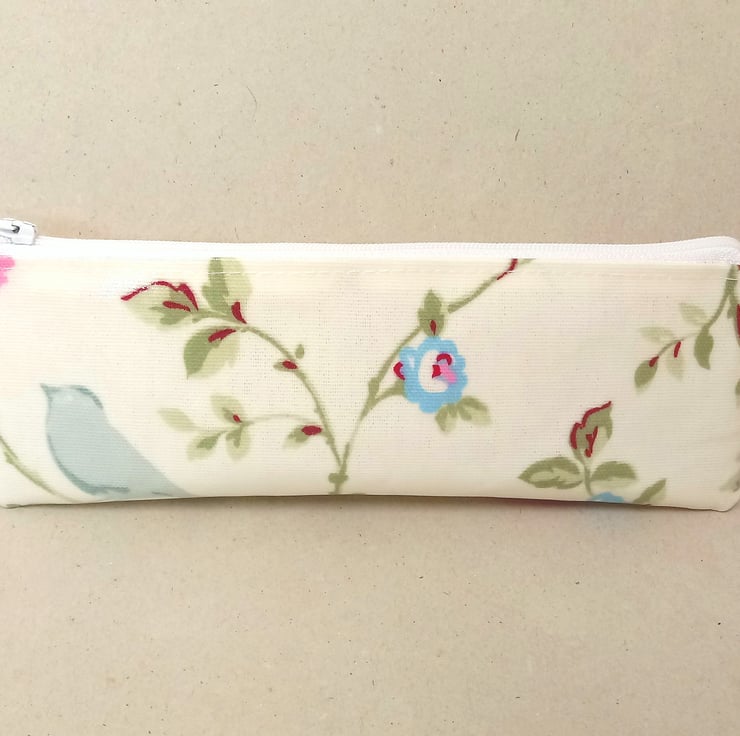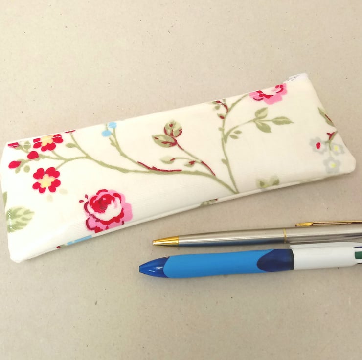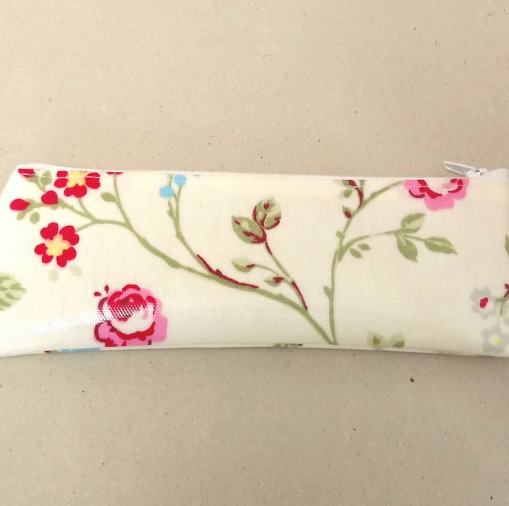 This is a lovely small pencil case, handmade in a cream oilcloth with pink, red and blue flowers.