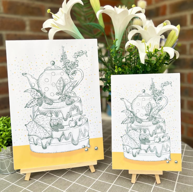 Illustration print - 'Acorn Tea Cake' is a A5 (14.8cm x 21cm) colour print of my pen illustration, featuring a teapot surrounded by nature on top of a cake. I finished this piece off on the computer to add a splash of colour.