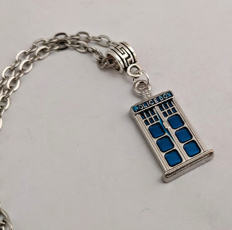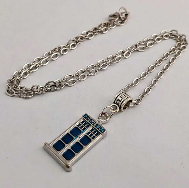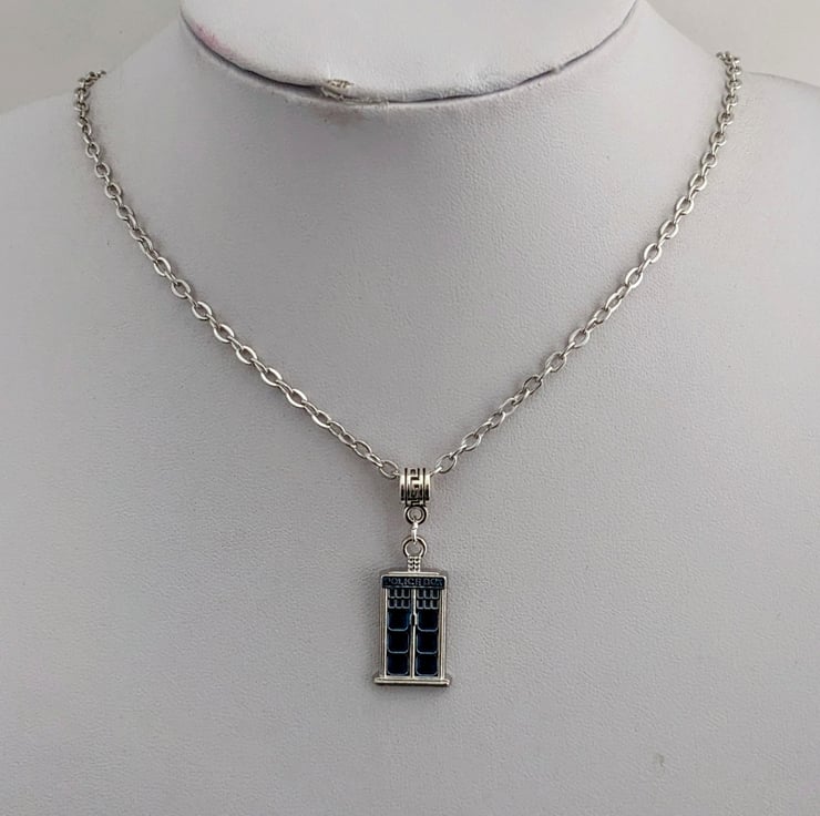 Blue enamel Tardis (20x10mm) on 18" silver tone chain. In an organza gift bag.