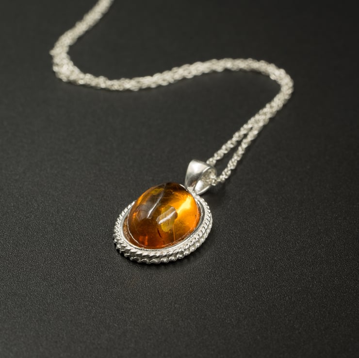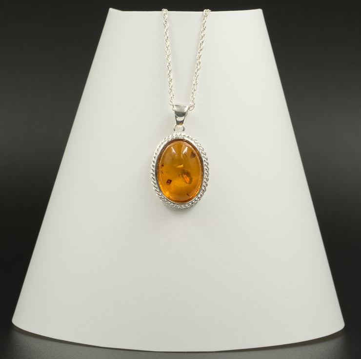 A deep honey tone Baltic amber stone is set into a rope edged sterling silver mount with an open back. The pendant hangs from a sterling silver 18 inch chain which fasten with a spring ring closure.