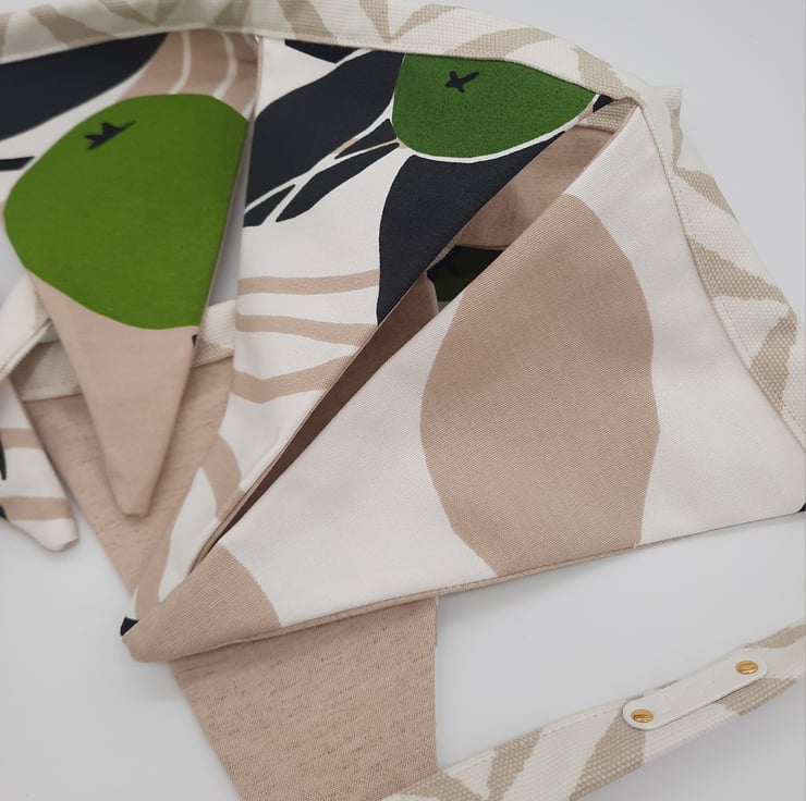 9 triangles of bunting in a beige, white, black and green pattern fabric.