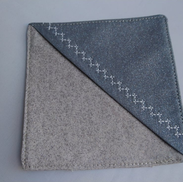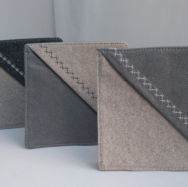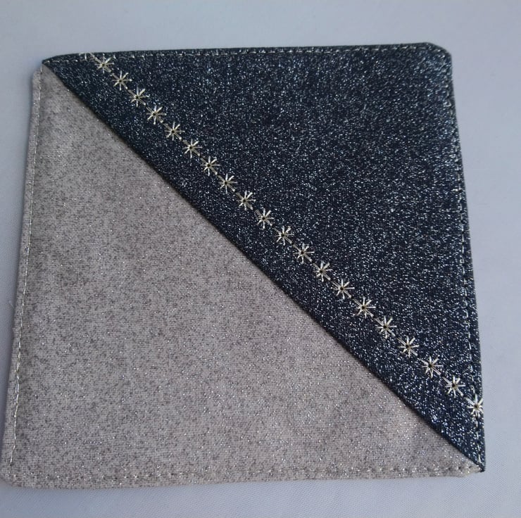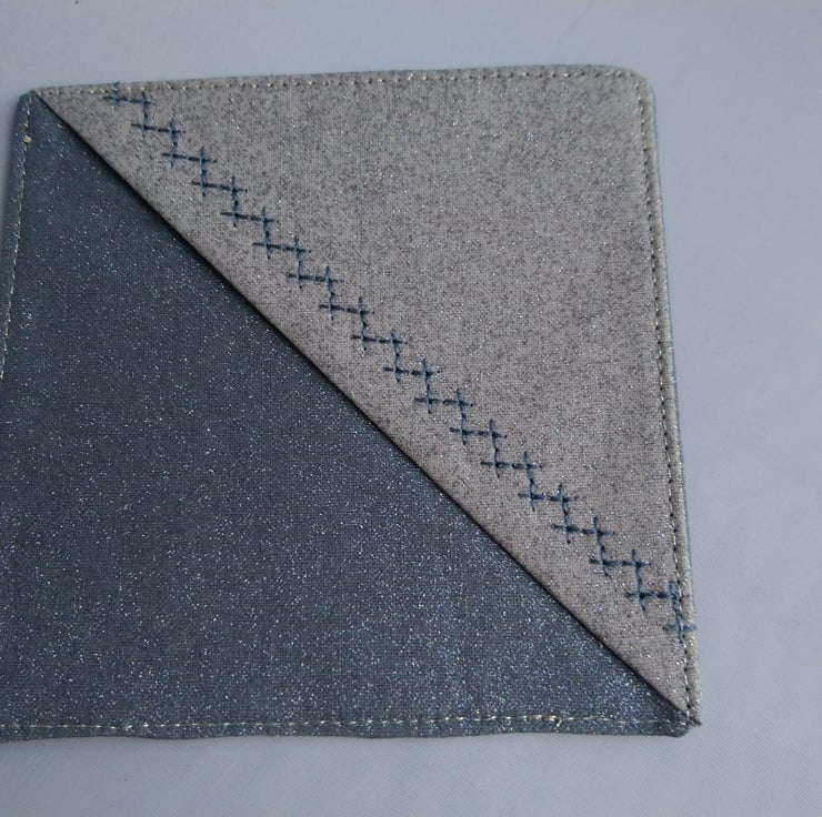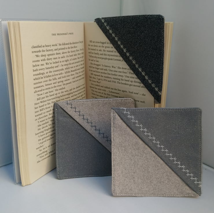 3 Fabric Corner Book Marks .These book marks are made from 100% cotton fabric ,with embroidered detail. The fabric has a lovely sparkle coating to it making it like a lightweight leather feel. I purchased this fabric from John Lewis and thought it was very unusual.