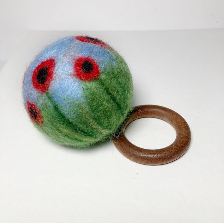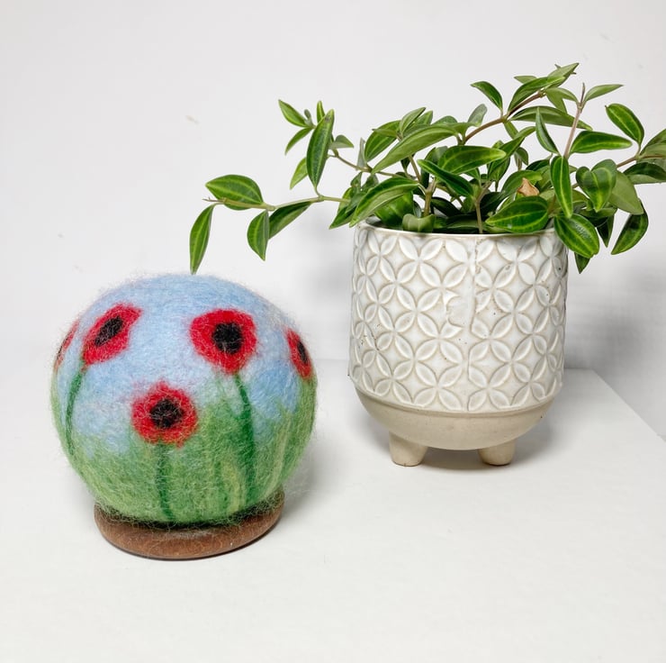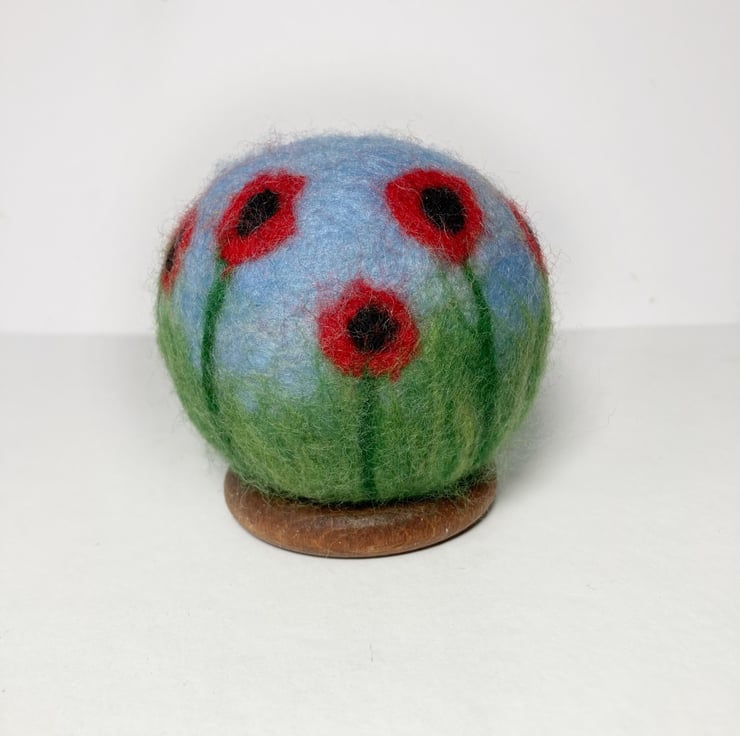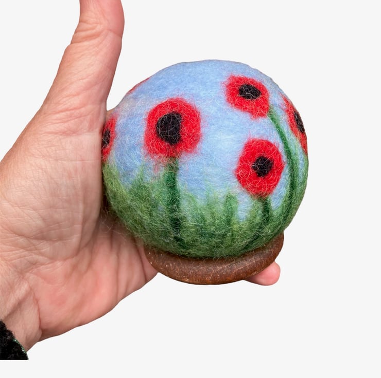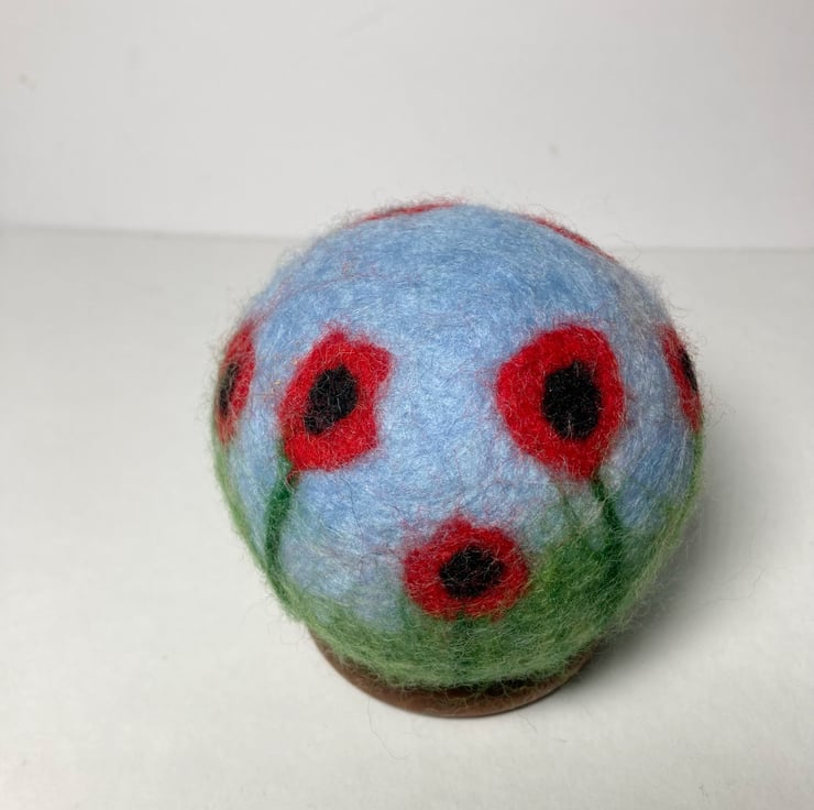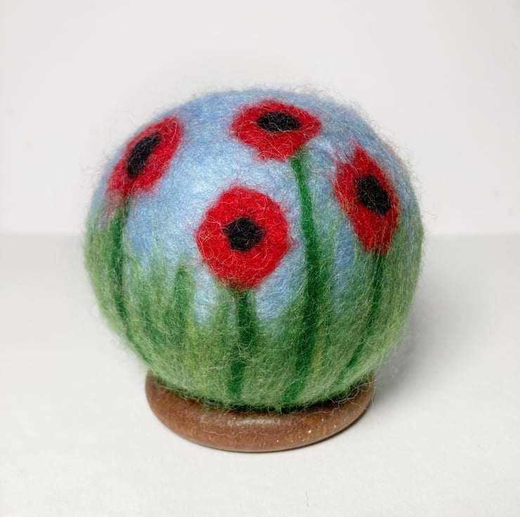 This decorative orb has been made from woollen fibres. A basic sphere has been felted and then covered in coloured wool fibres to create the sky and grass, and the poppy decoration added. The poppies have been added all around the sphere to provide decoration in all orientations. The sphere is then felted for a second time to ensure all the woollen fibres adhere and are well felted.