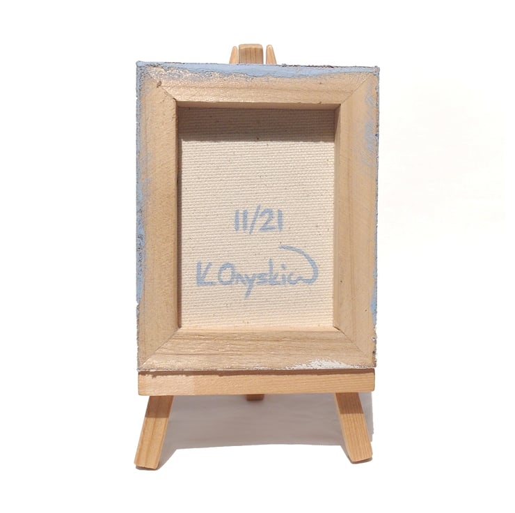 The snowy scene will either come with a 14cm (5.5") miniature wooden easel for display, or will be strung with a ribbon in a colour that matches the painting so it can be hung on a wall (as in the final photo). Just choose with easel or ribbon hanging when you buy.