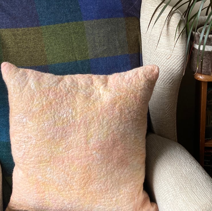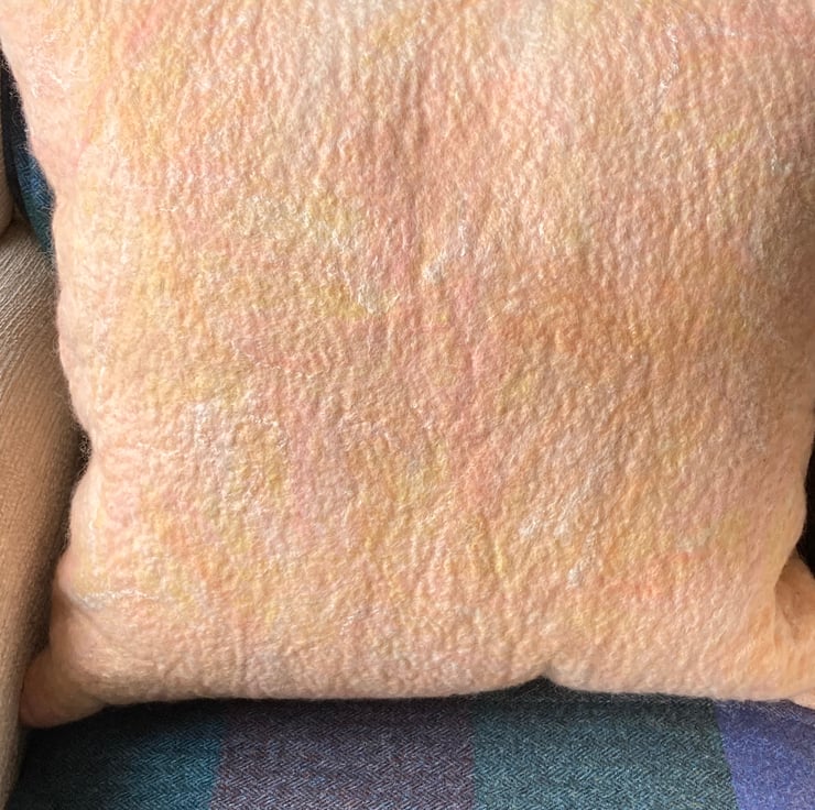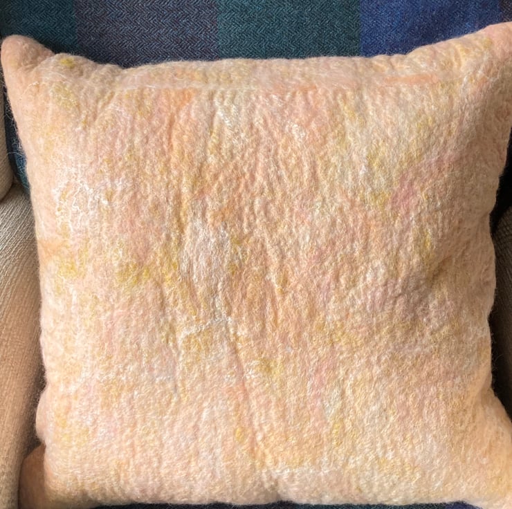 A beautiful handmade felted cushion cover with inner cushion pad. Made by wet felting peach, cream merino wool with silk, to create a wonderfully soft, comfortable cushion. Duck feather filled inner cushion pad.