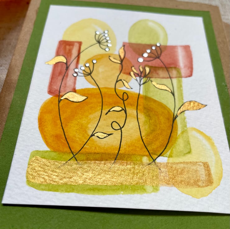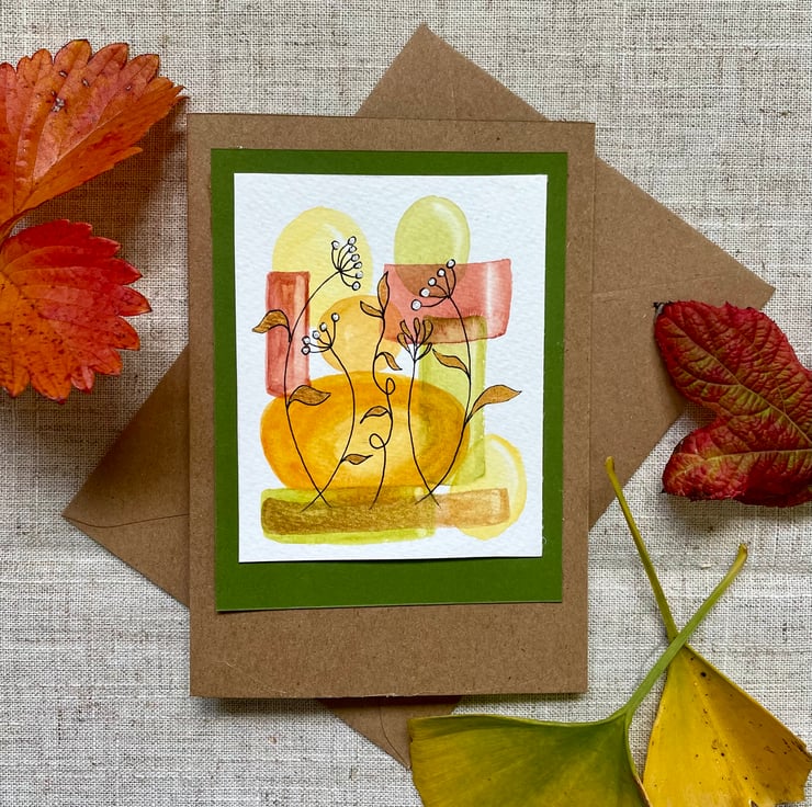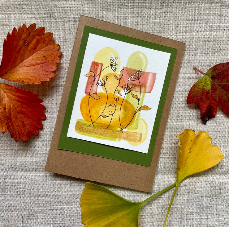 This card features an abstract painting in beautiful autumn colours of reds, oranges, yellows and greens, hand painted with artist quality watercolour and overlaid with leafy tendrils in ink and gold and seed heads in ink with silver watercolour paint, the card has been left blank for any occasion from birthday card to a thank you note but could also be framed and put up on a wall.