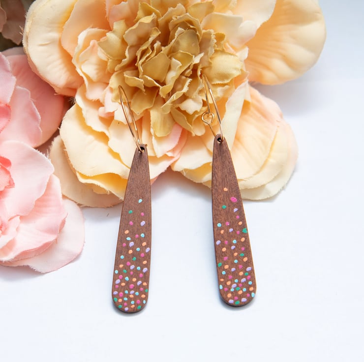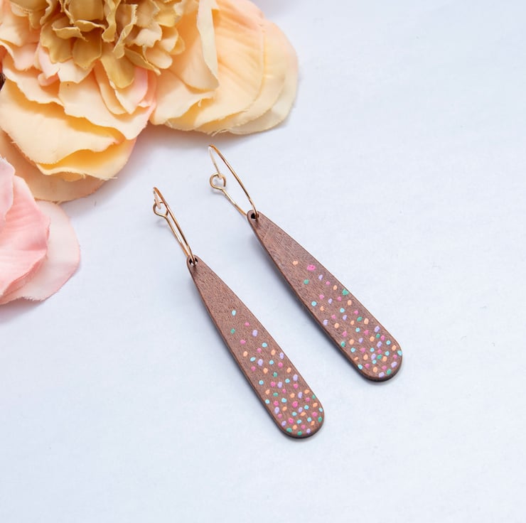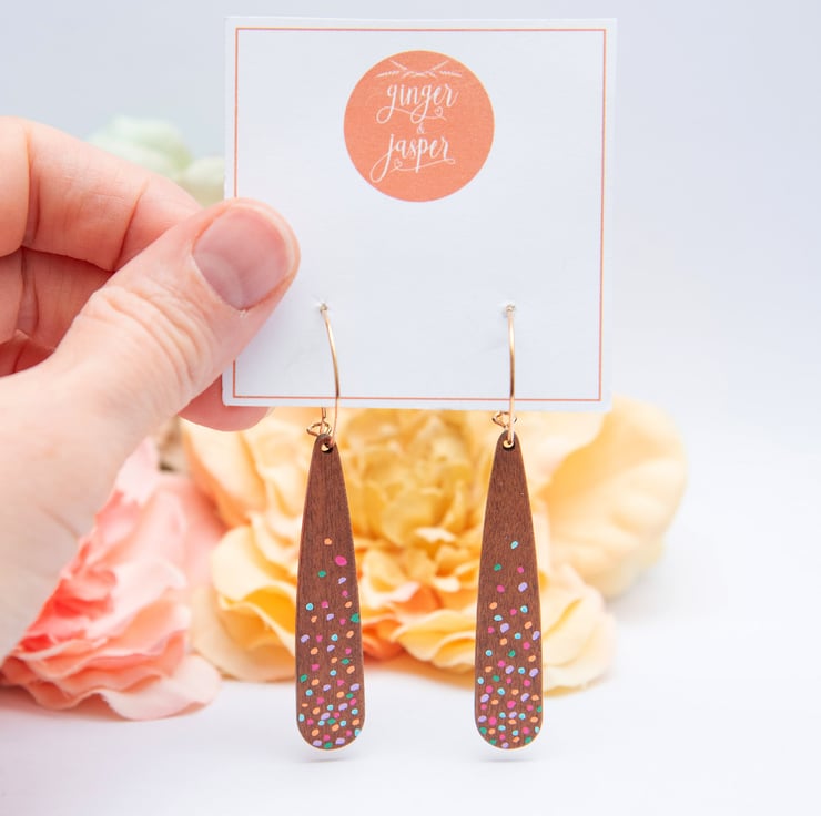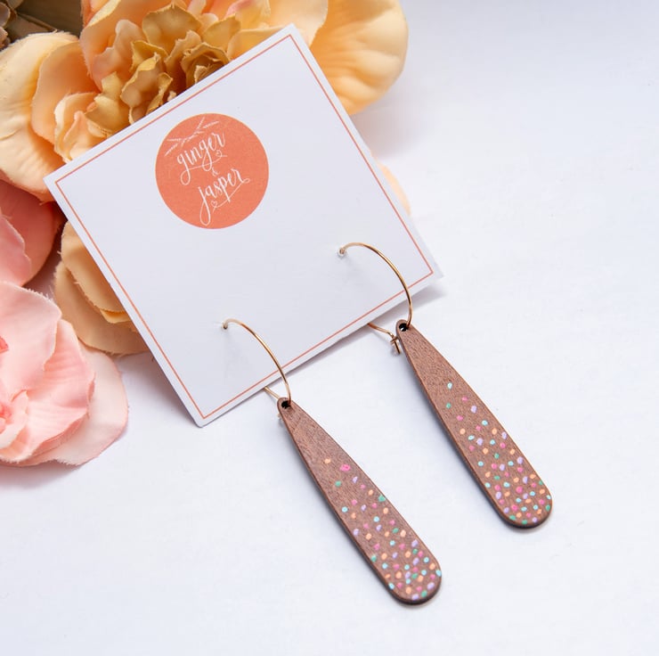 Stunning dangle drop earrings featuring wooden teardrops hand painted with colourful polka dots. Choose from gold plated hoops or silver plated hoops. PLEASE NOTE - comment with the colour hoops you would like when ordering, if no comment is added the earrings will be supplied on gold hoops. They will be delivered to you on a Ginger & Jasper branded card and gift wrapped, as pictured. 7cm long and lightweight.