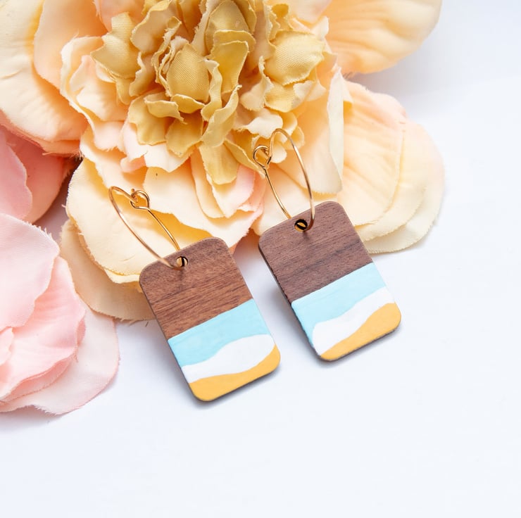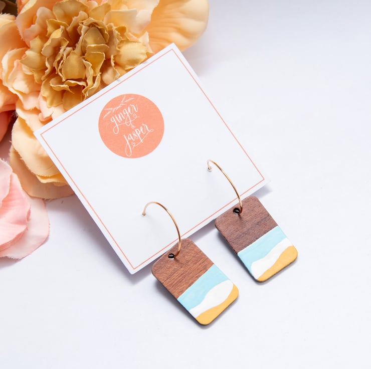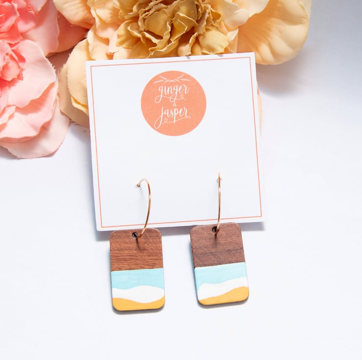 Stunning dangle drop earrings featuring wooden rectangles hand painted with an abstract seashore design. Choose from gold plated hoops or silver plated hoops. PLEASE NOTE - comment with the colour hoops you would like when ordering, if no comment is added the earrings will be supplied on gold hoops. They will be delivered to you on a Ginger & Jasper branded card and gift wrapped, as pictured. 5cm long and lightweight.