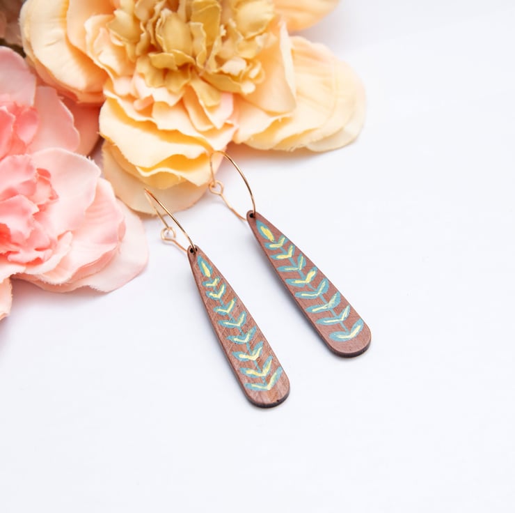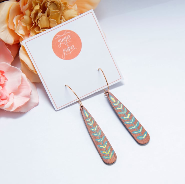 Stunning dangle drop earrings featuring wooden teardrops painted with a teal & gold leaf design. Choose from gold plated hoops or silver plated hoops. PLEASE NOTE - comment with the colour hoops you would like when ordering, if no comment is added the earrings will be supplied on gold hoops. They will be delivered to you on a Ginger & Jasper branded card and gift wrapped, as pictured. 7cm long and lightweight.