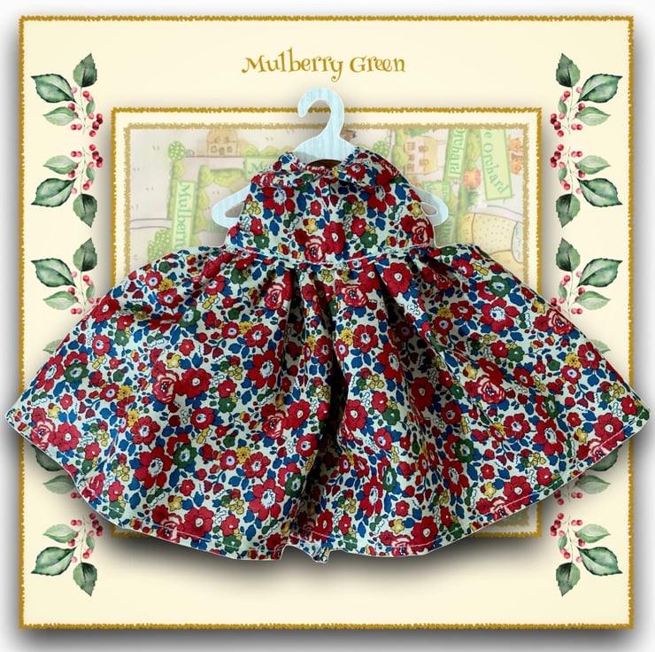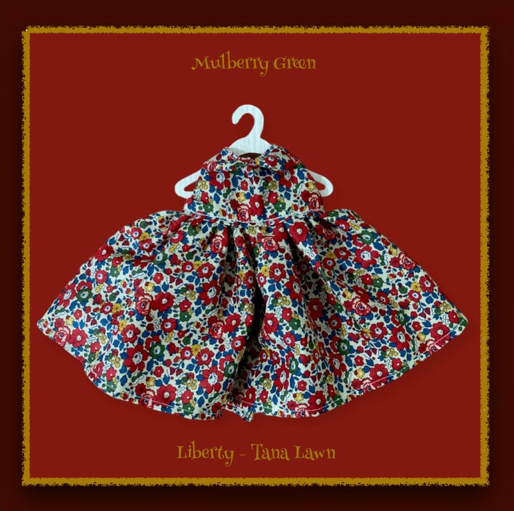 A gorgeous little dress in Liberty Tana Lawn fabric to fit the Mulberry Green characters. The dress is made from best quality designer cottton, has a Peter Pan collar and a lined bodice.
