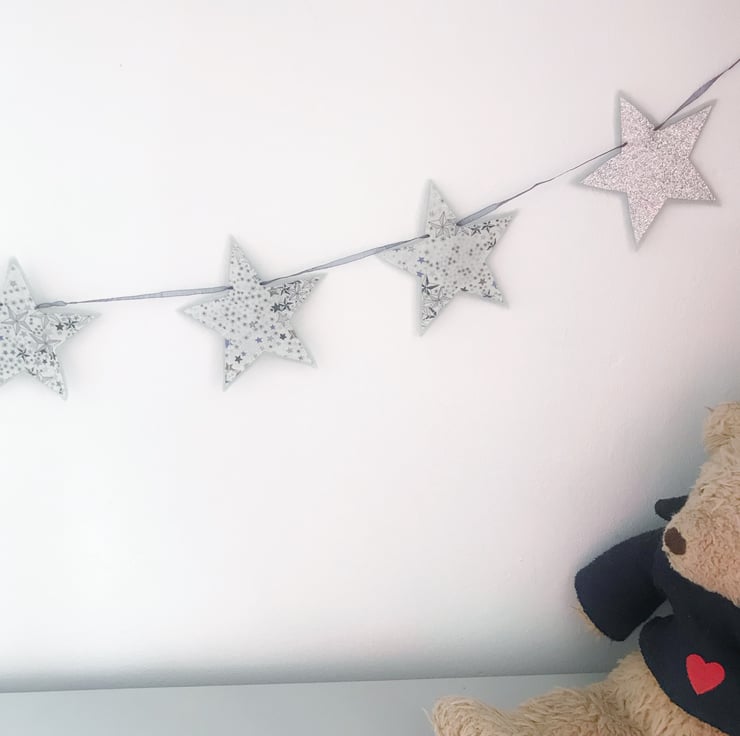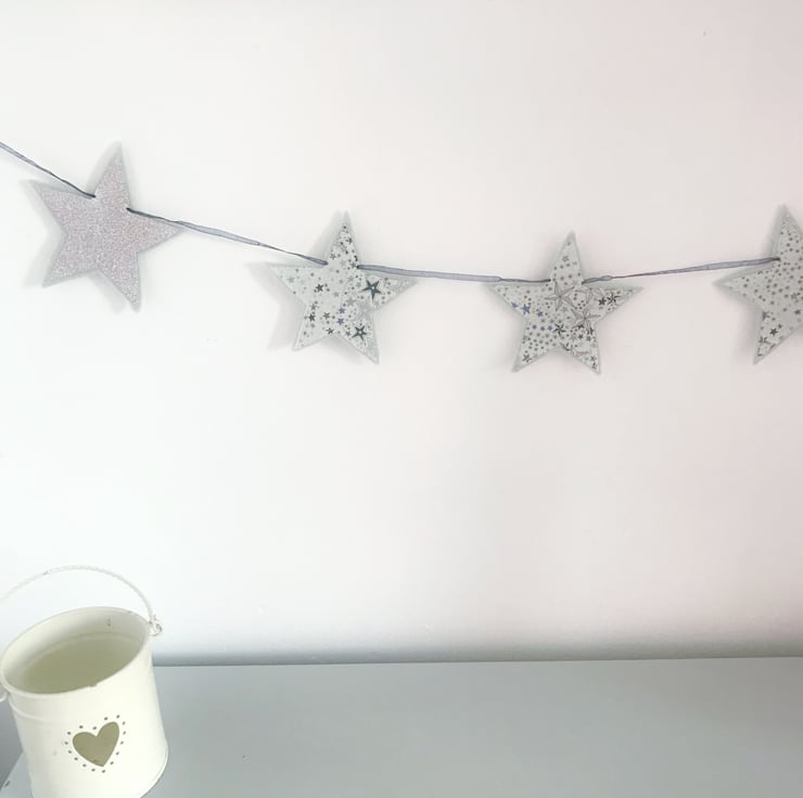 A gorgeous star shaped garland, perfect to decorate at Christmas or to leave up all year round. Stars in a Liberty of London Tana Lawn fabric are backed with silver felt and interspersed with two sparkling silver stars to complete this garland. The stars are strung together with a delicate ribbon with hanging loops at either end.
