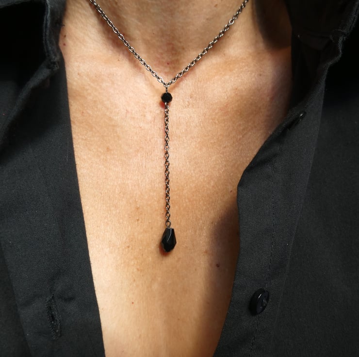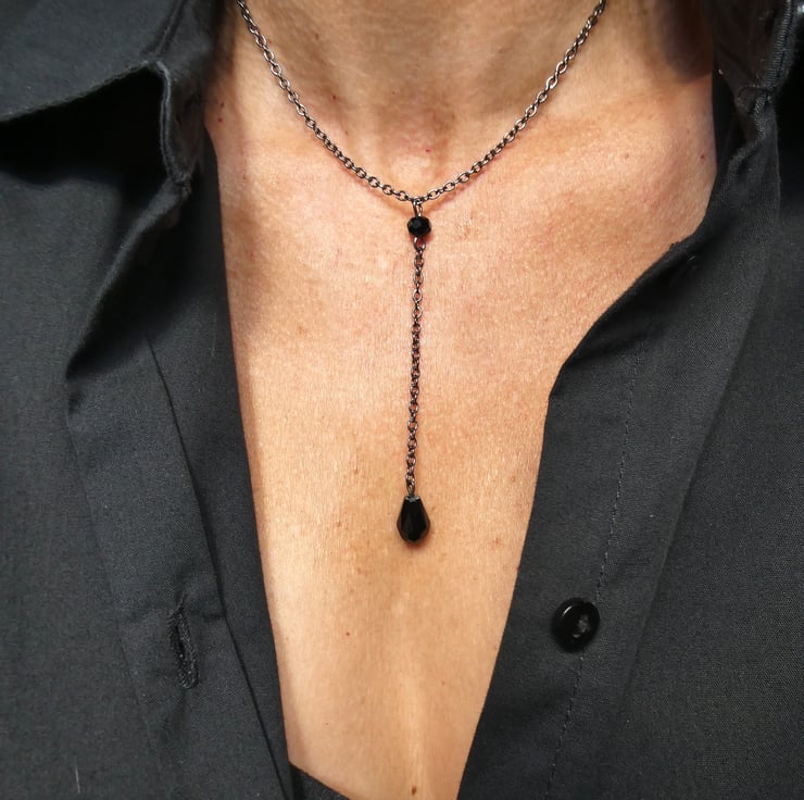 This listing is for a gunmetal black choker style lariat necklace. It features a central round faceted black crystal and lariat chain complete with black faceted teardrop shaped crystal.