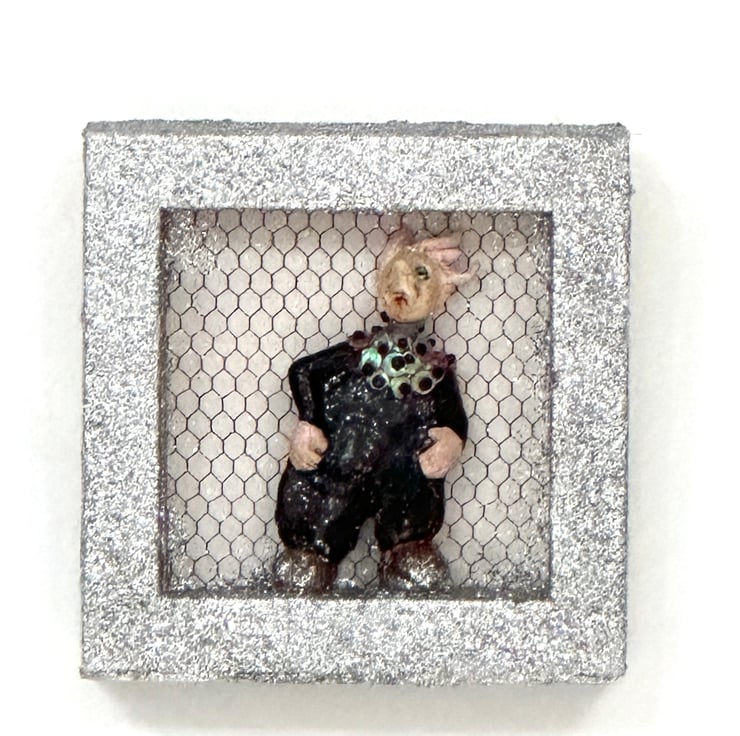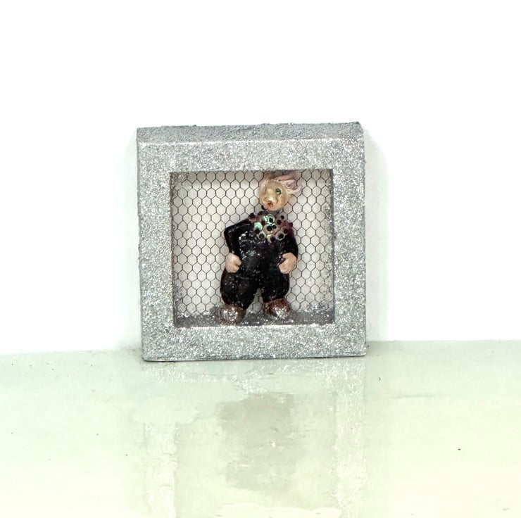 "Adorn your space with whimsical charm courtesy of this delightful handmade quirky ceramic figure, nestled within a sleek box frame.