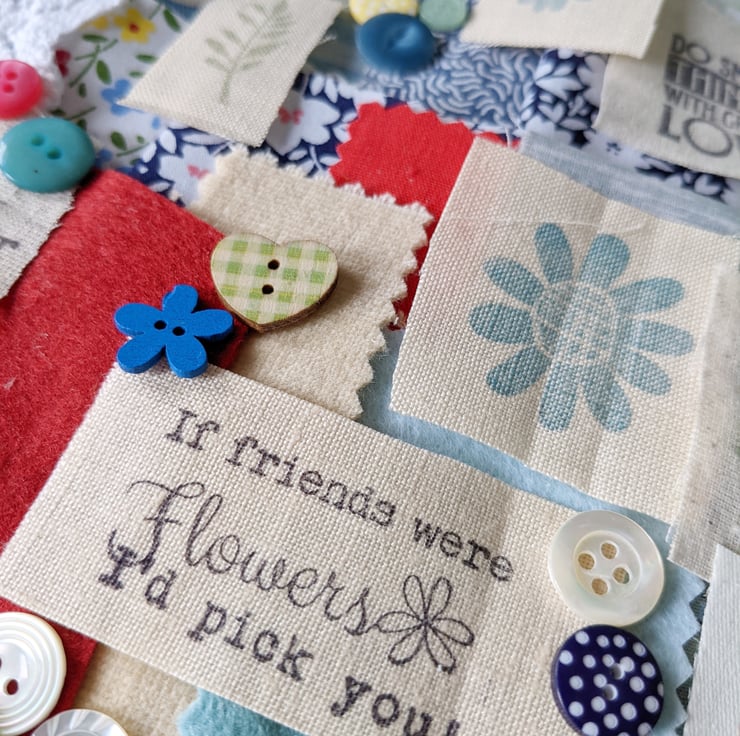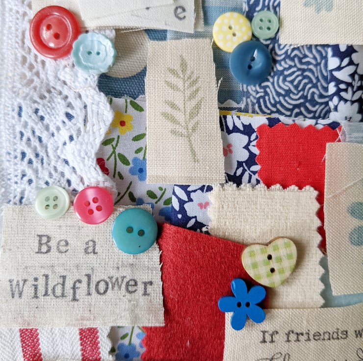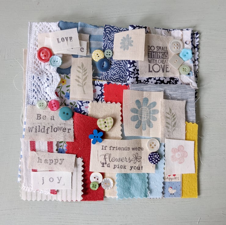 A collection of mixed fabric pieces with trims, buttons and hand stamped snippets and words.