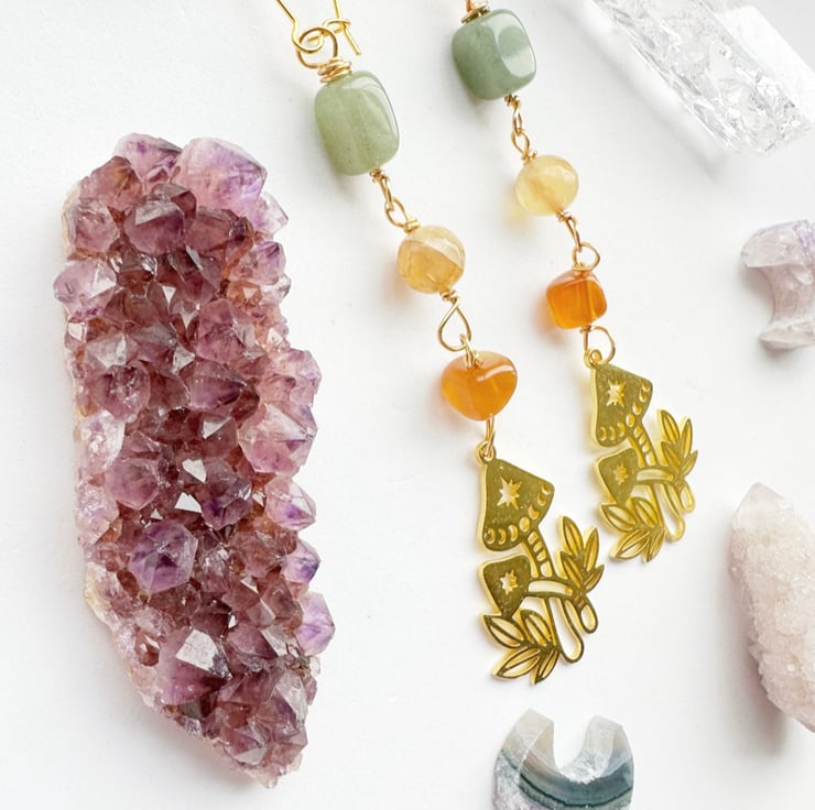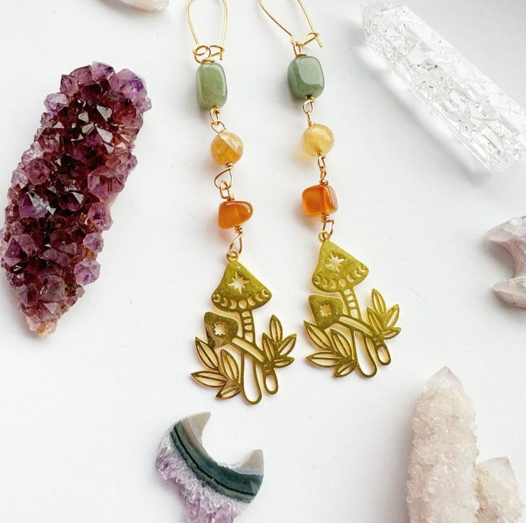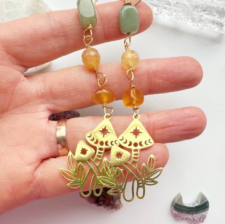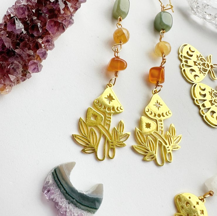 Magical Luna Mushroom Crystal Gold Earrings hand wrapped with love & light