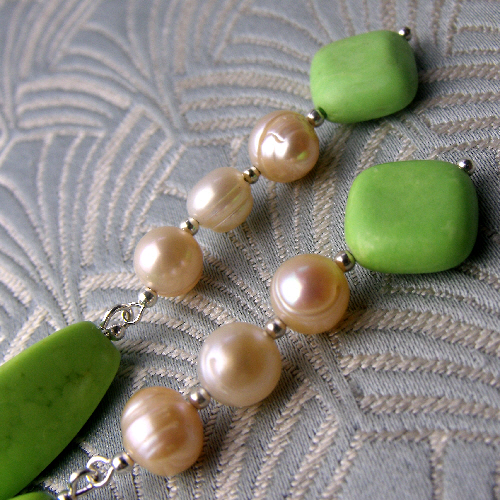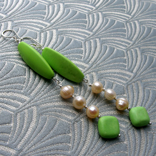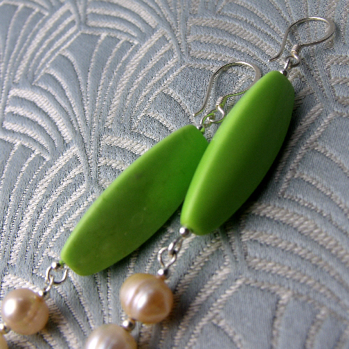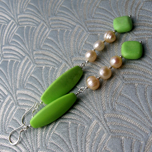 Long green earrings that have long rice shaped rice beads of green agate and diamond shaped green agate beads and I have spaced these green gemstone beads with rich cream coloured freshwater pearls.