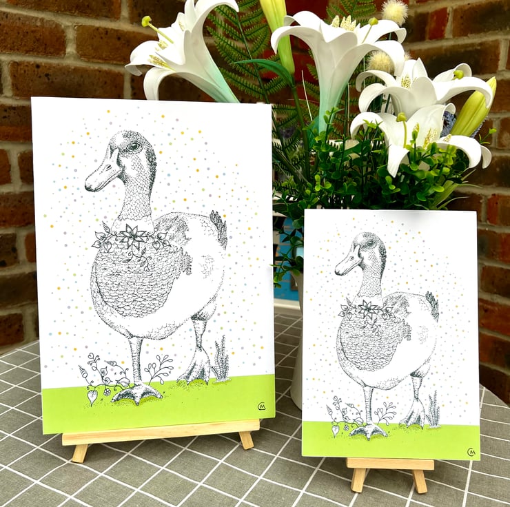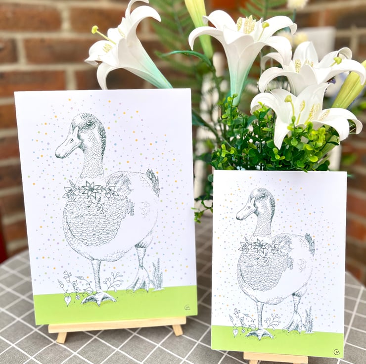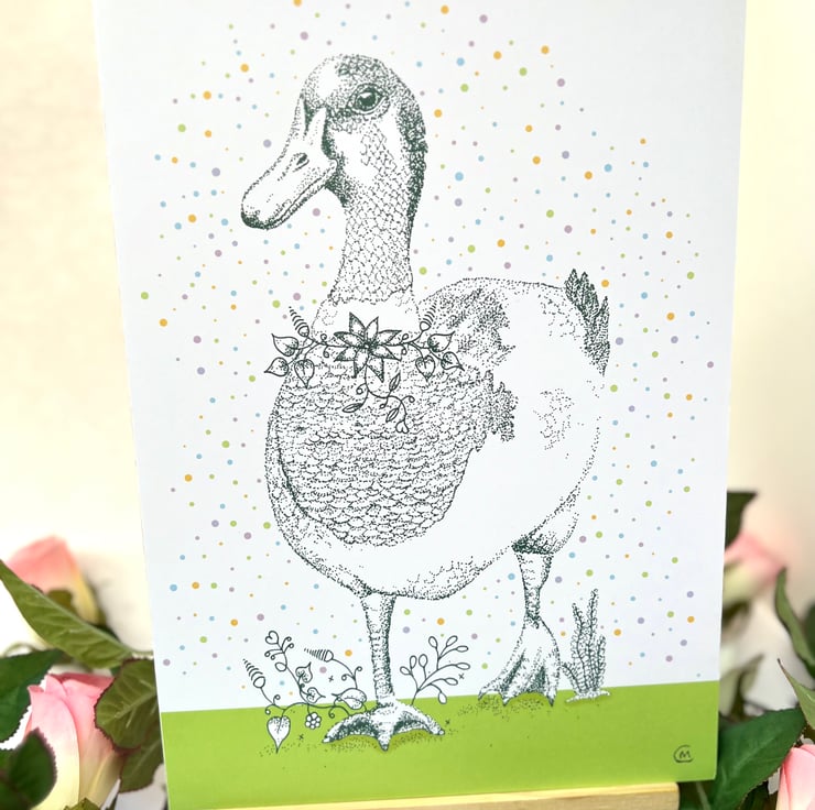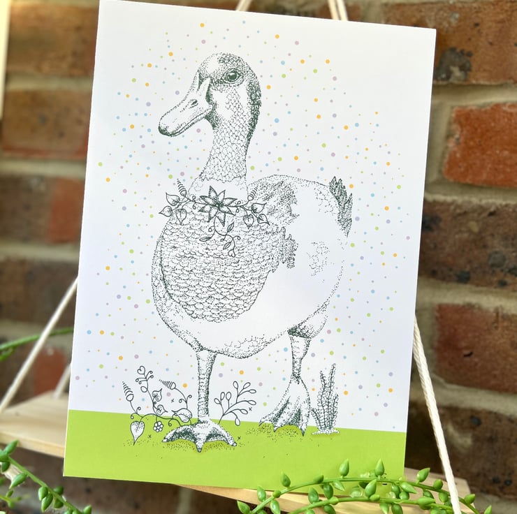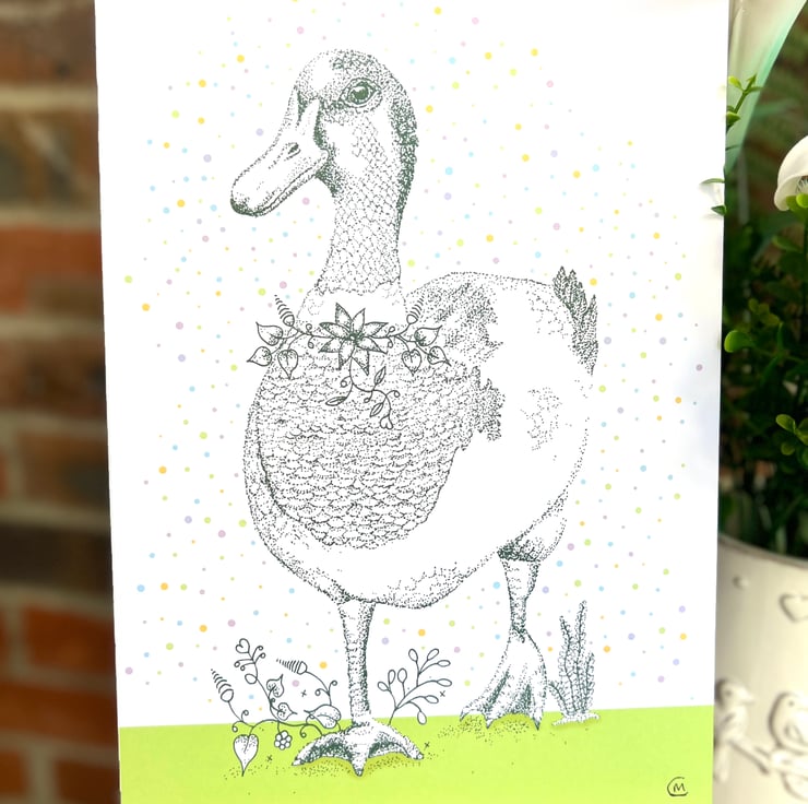 Illustration print - Dotty the Duck, is a A5 (14.8cm x 21cm) colour print of my pen illustration, featuring a pretty duck. I finished this piece off on the computer to add a splash of colour.