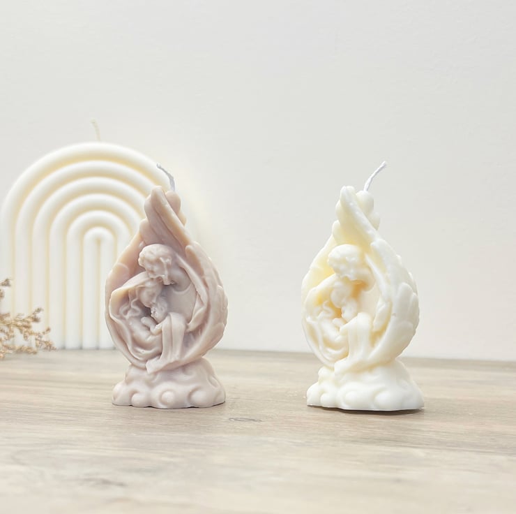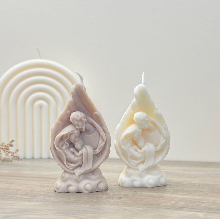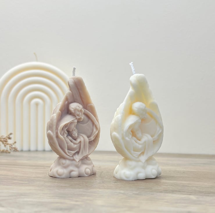 Bring the Christmas spirit into your home with our beautiful mini nativity scene candle, featuring Mary, Joseph and Baby Jesus surrounded by angel wings. Wrapped in warmth and set atop the clouds, our Christmas nativity candles are handmade with love using only 100% natural soy wax, making them just as kind to the planet as they are pretty to look at. Our mini nativity candles will make the ideal addition to your Christmas decorations!