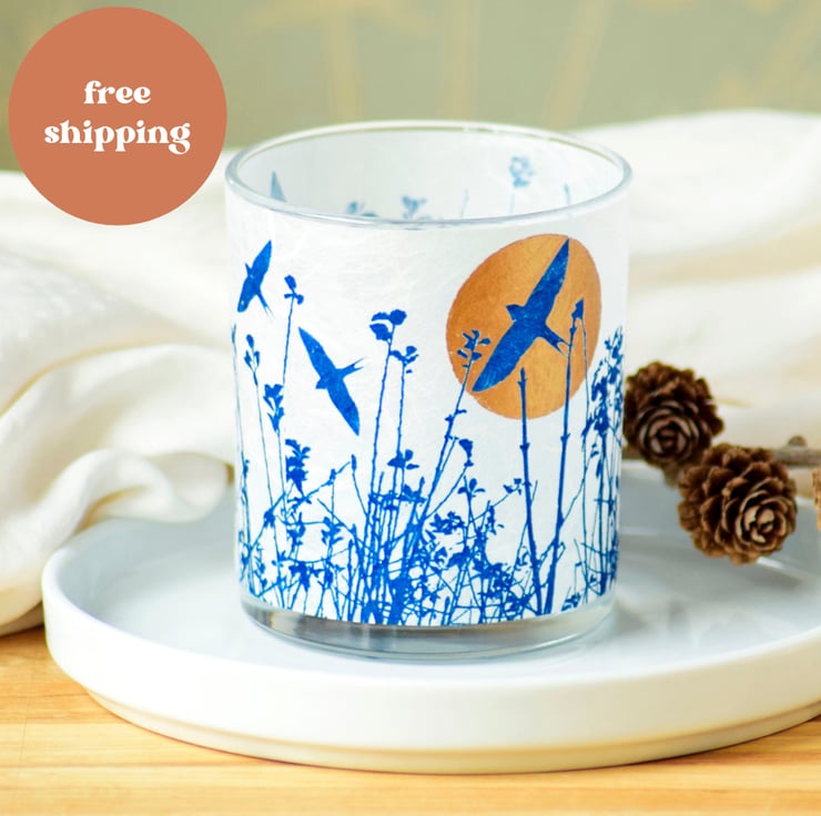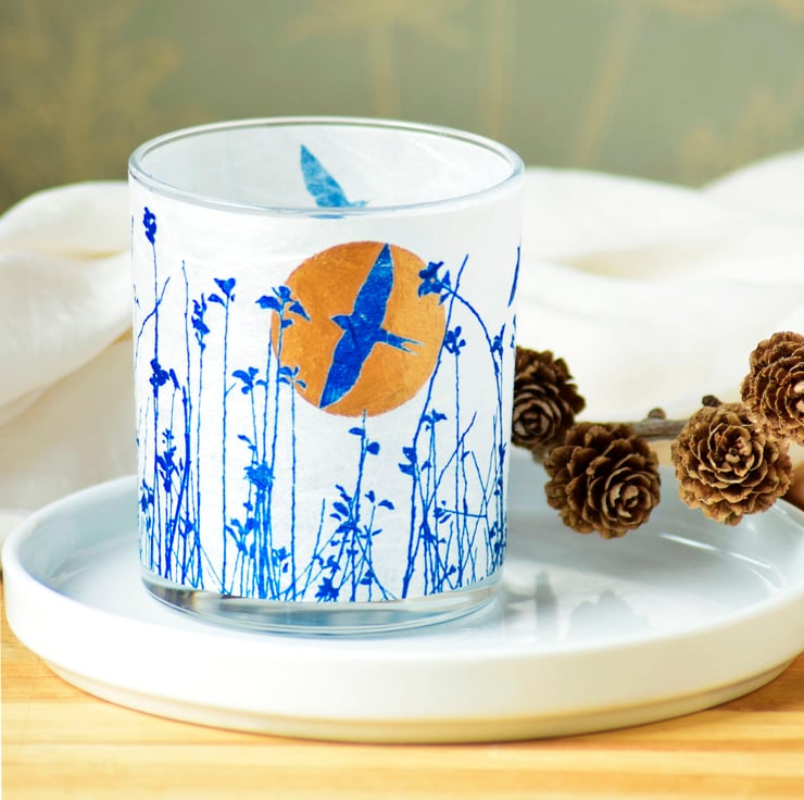 Swallows swoop over a delicate meadow design on this unique candle holder. The hand painted gold circle creates a luxurious feel to this candle holder, evoking the light of a setting sun behind the Swallow silhouette. When the candle is lit the light flickers through bringing the image to life!